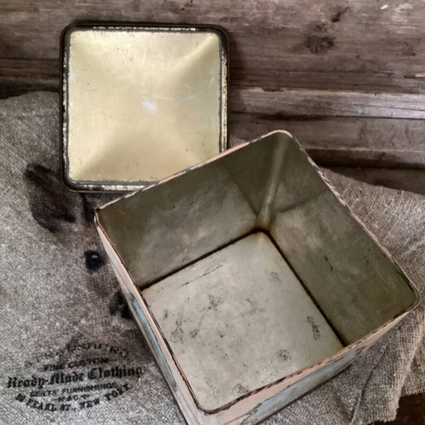 Mooi oud vierkant blik met los deksel, kastelen rondom 11x11x16 cm