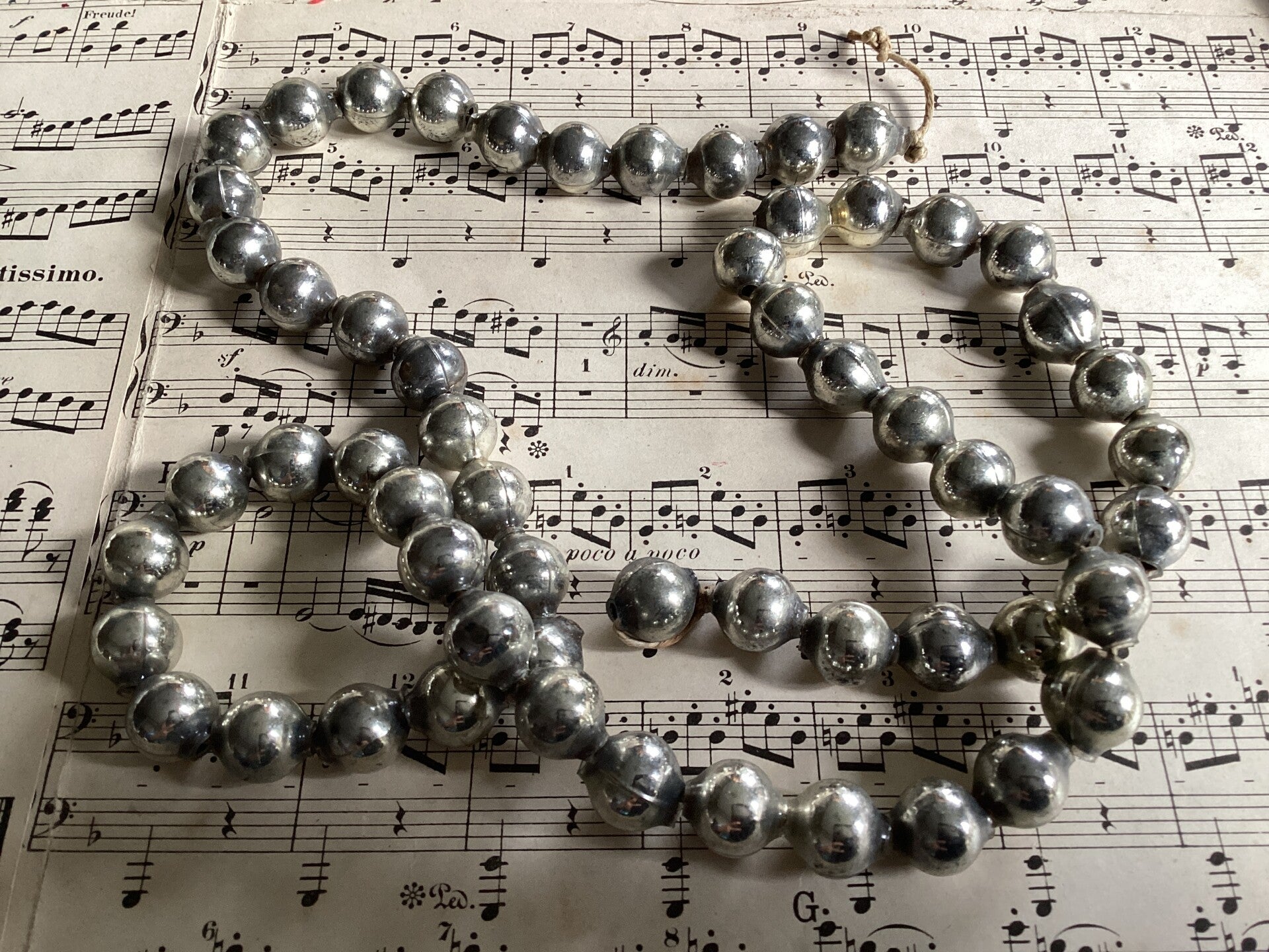 Kerstslinger van glas, zilver, enkele kraal, lengte 75 cm, diam kraal 1.2 cm