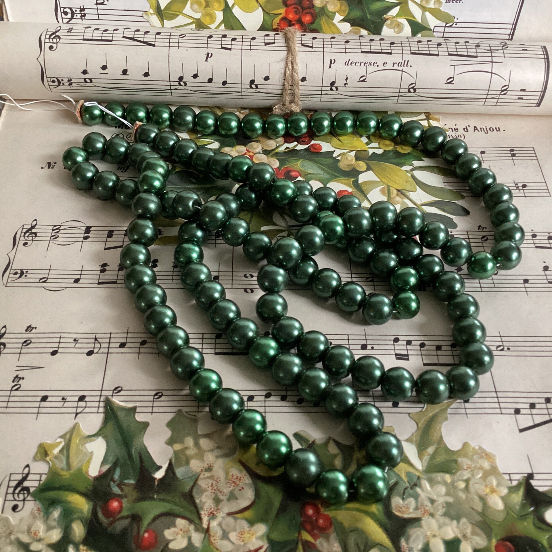Kerstslinger van glazen groene kralen, lengte 110 cm, diam. kraal 1 cm
