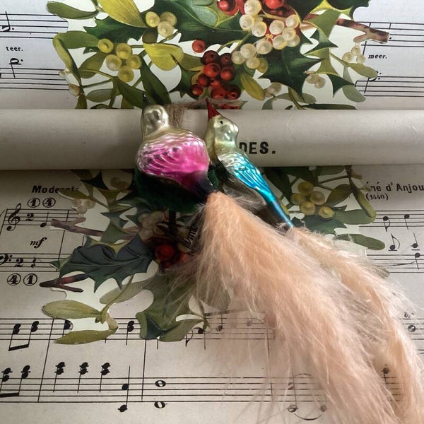 Antieke kerstbal dubbele vogel gekleurd op clip met nestje