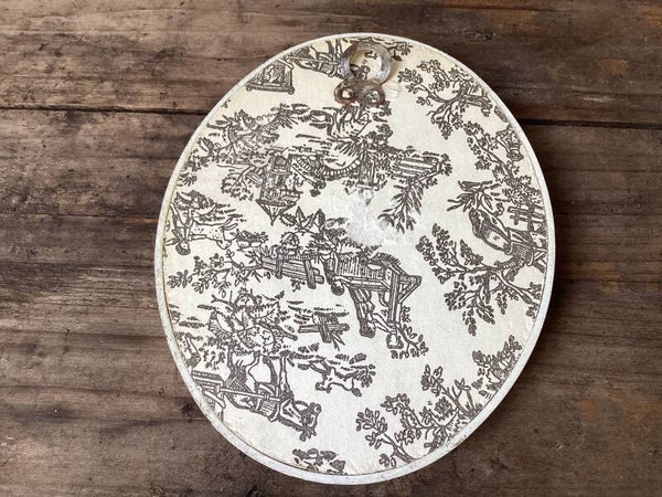 Romantisch ovaal frans schilderijtje van zijde stof 8x10x2 cm