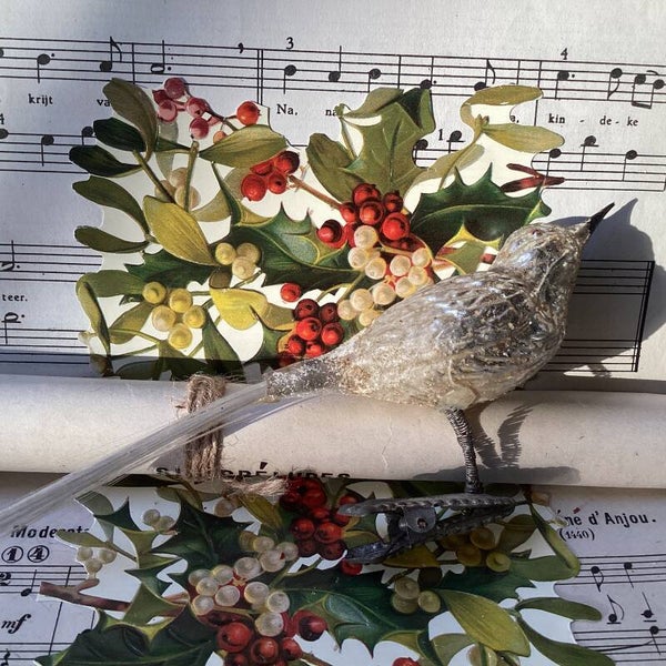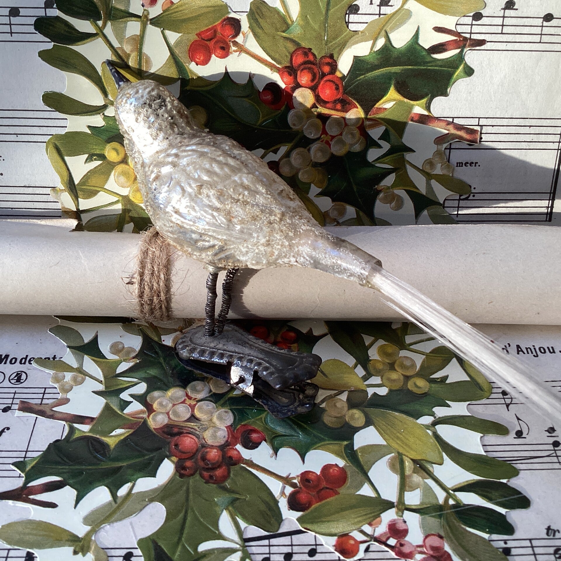 Antiek zilveren vogel op dubbele clip, fiberstaart rond 1900 17 x9 cm
