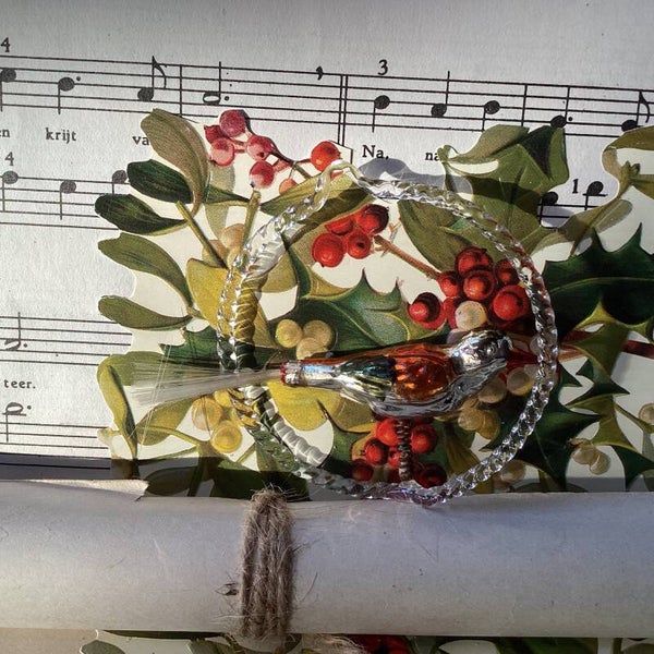 Antiek vogeltje in glazen cirkel, op veer, heel mooi, 9 cm