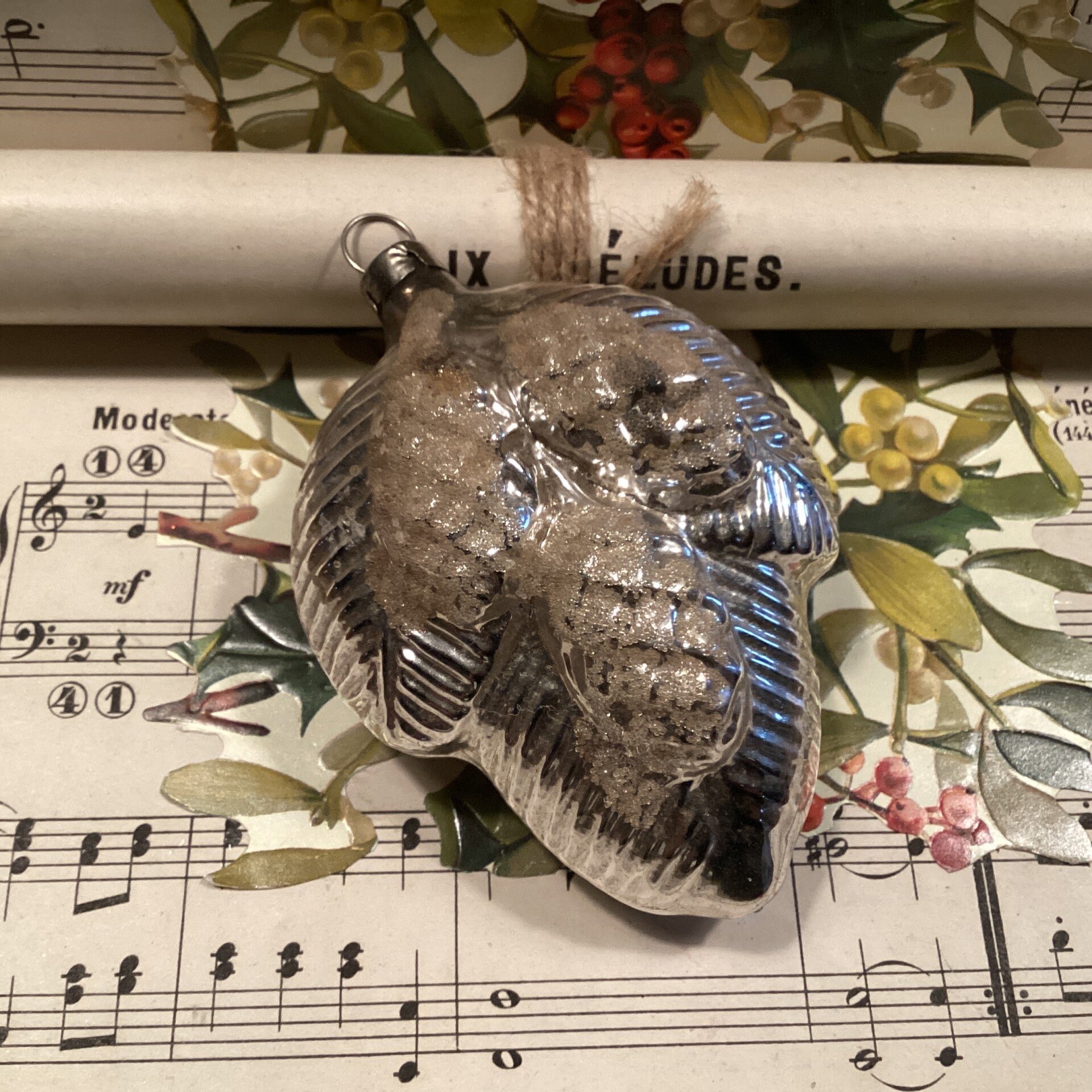 Antieke kerstbal met bruin gesuikerde dennenappels, op tak, mooi reliëf beiden zijden 10x7x4 cm