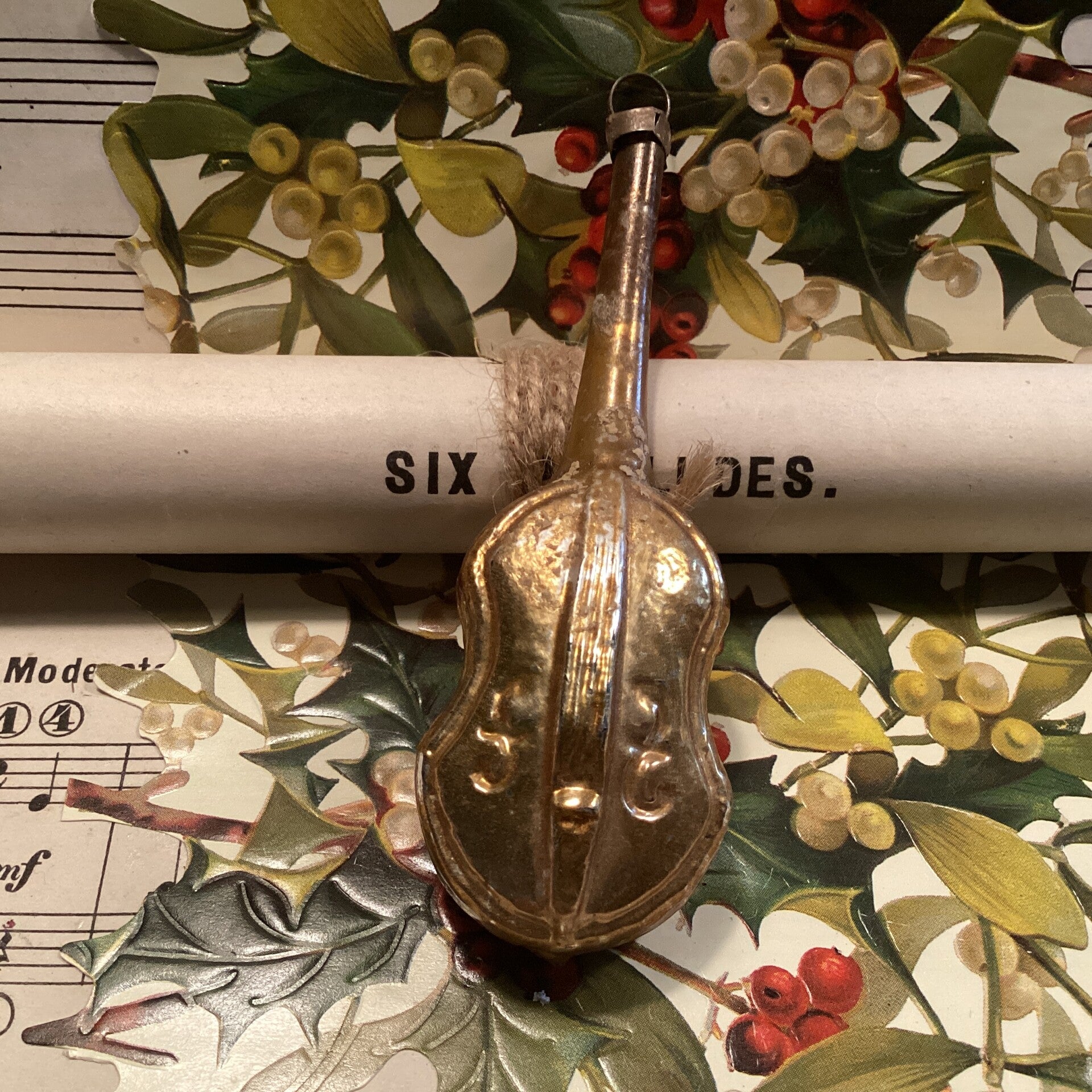 Antieke kerstbal cello/contrabas mooi goudkleurig