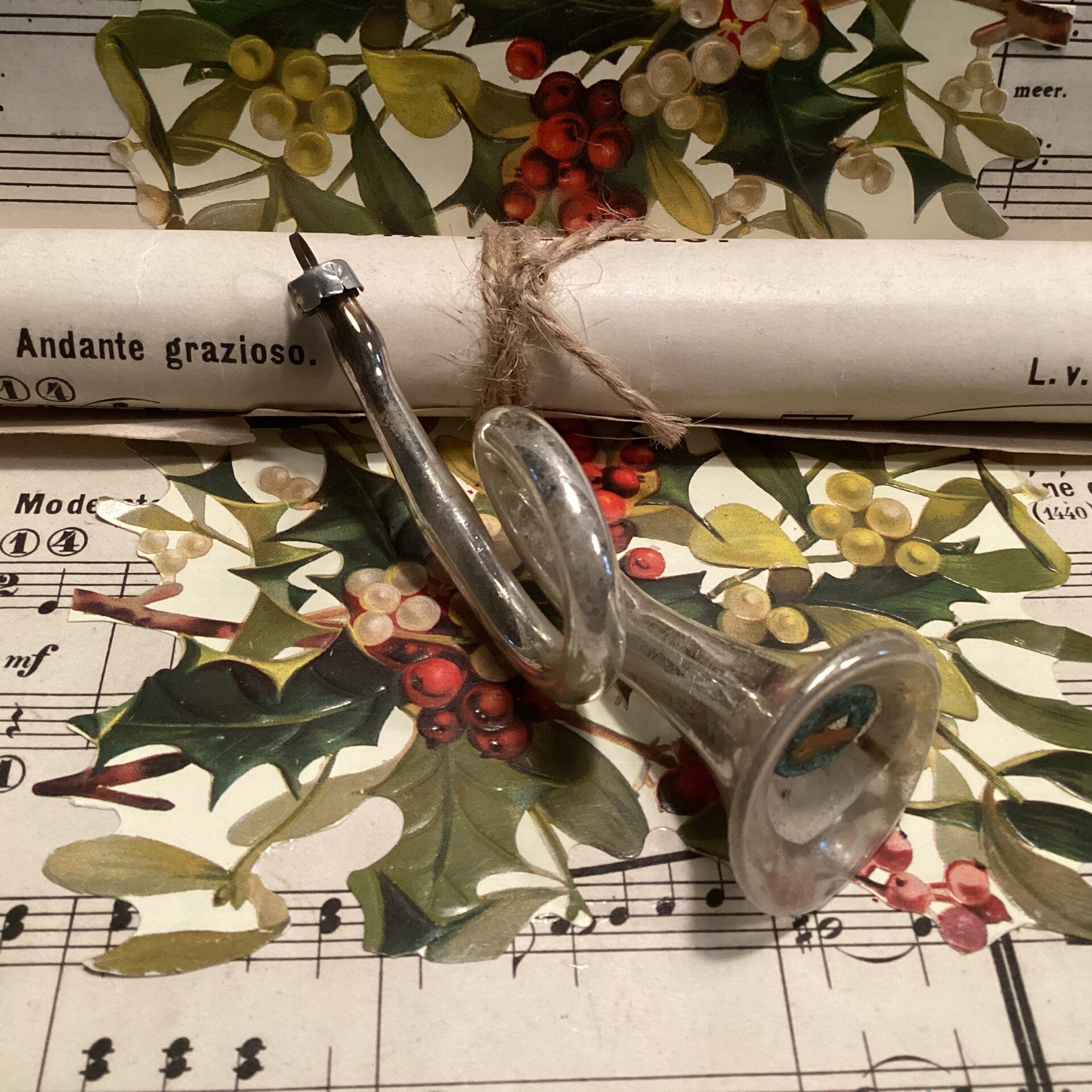 Antieke kerstbal trompet, met rietje, zacht geluid, 10 cm