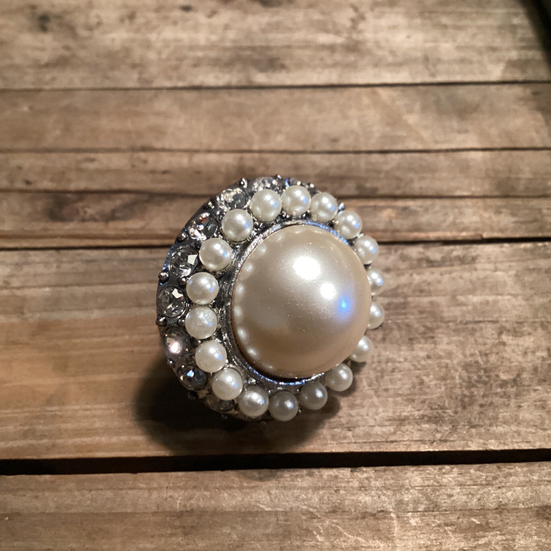 Verstelbare ring zilver grote parel met kleine pareltje en strass diam.3 cm