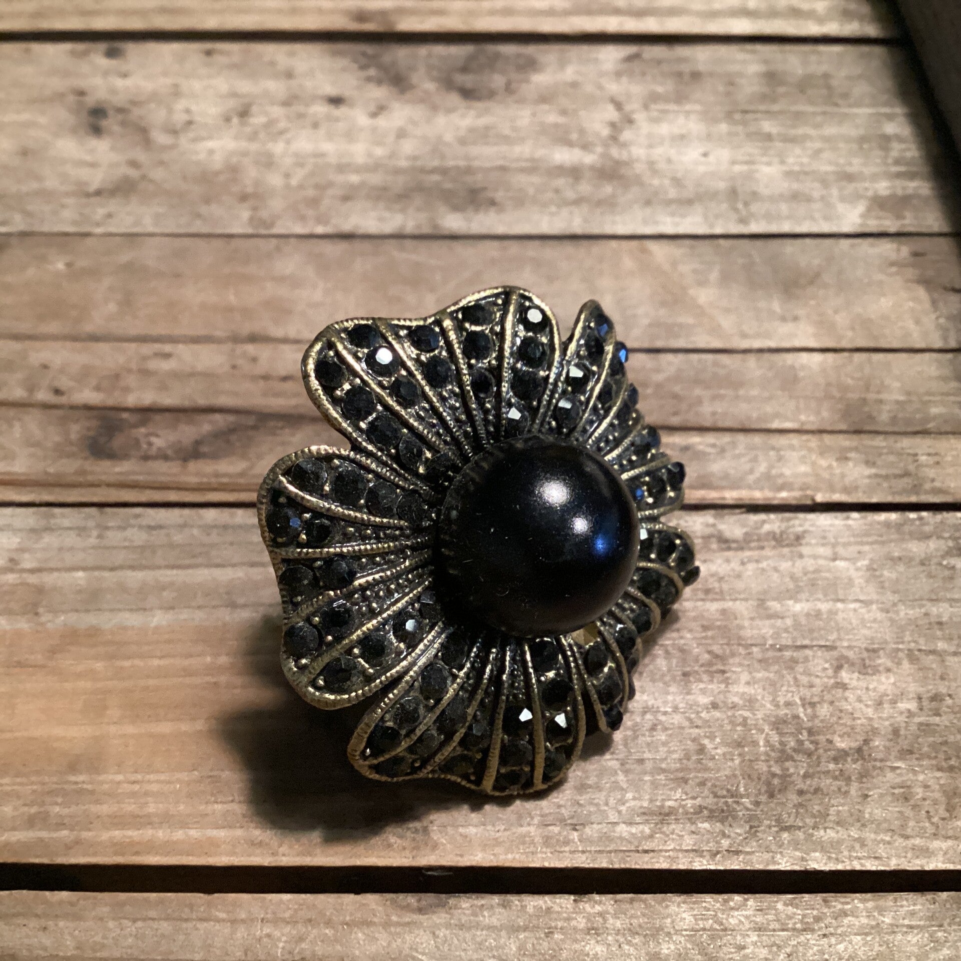 Verstelbare ring messing bloem, zwarte strass en steen 4 cm