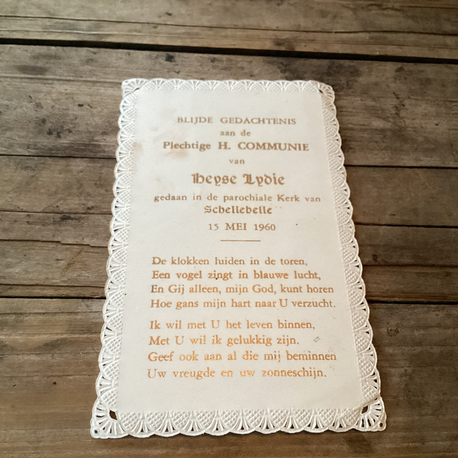 Religieus antiek communie prentje met kant