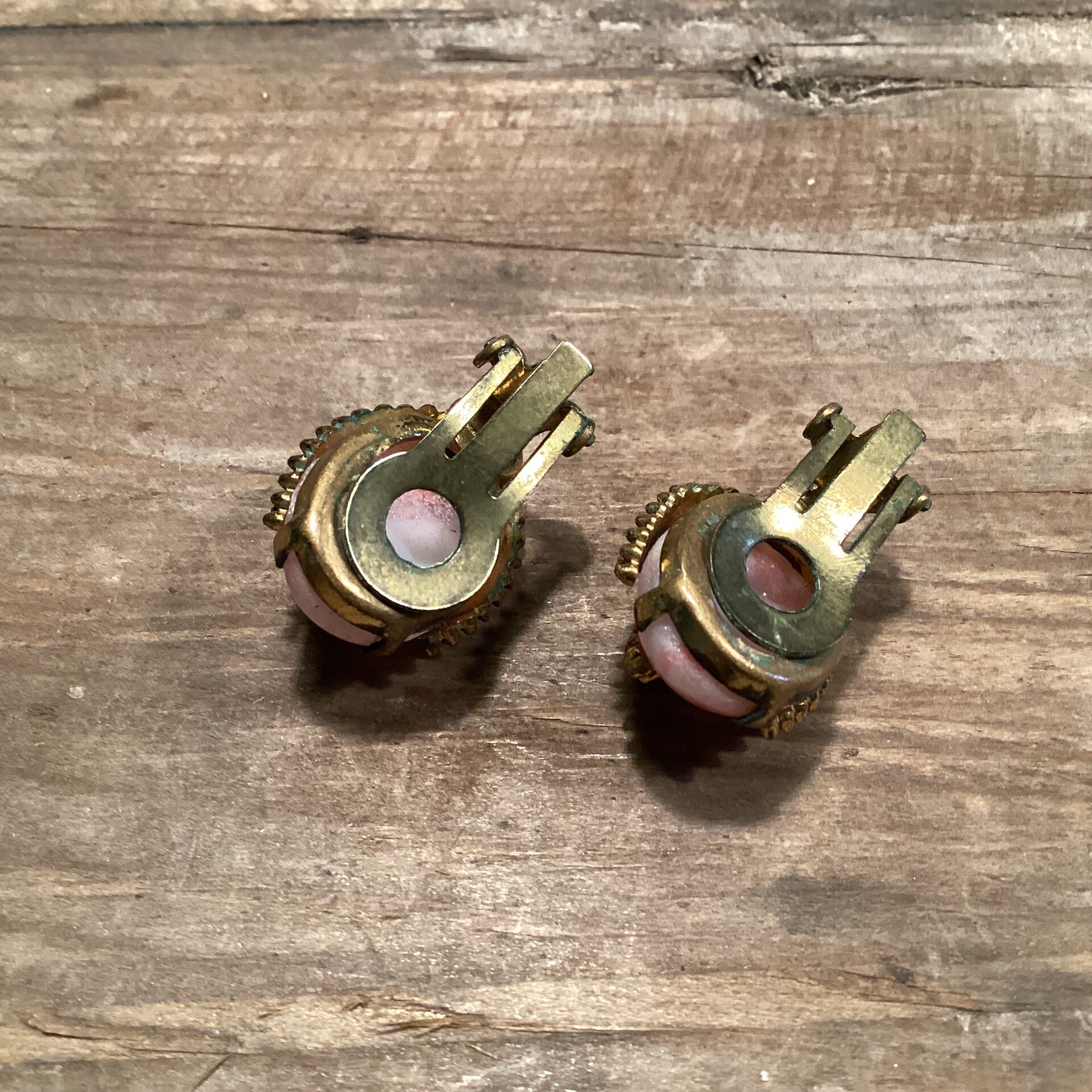 Vintage oorclips met roze steen en bewerkte blad
