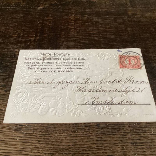 Antieke verjaardagskaart met kabouters in reliëf en stof, 1905, juweeltje!