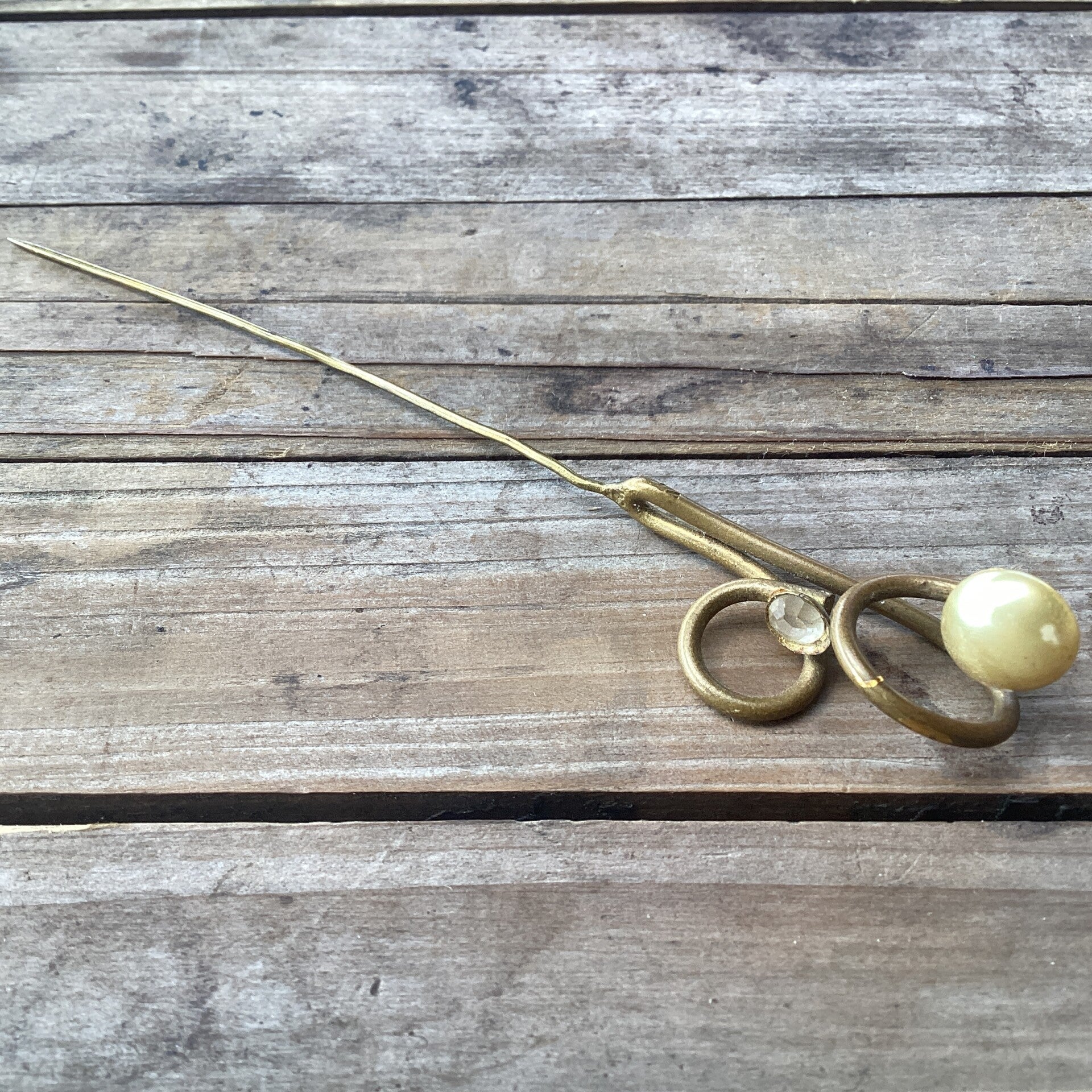 Antieke hoedenspeld met parel en steentje in gekrulde setting