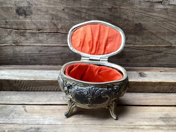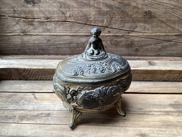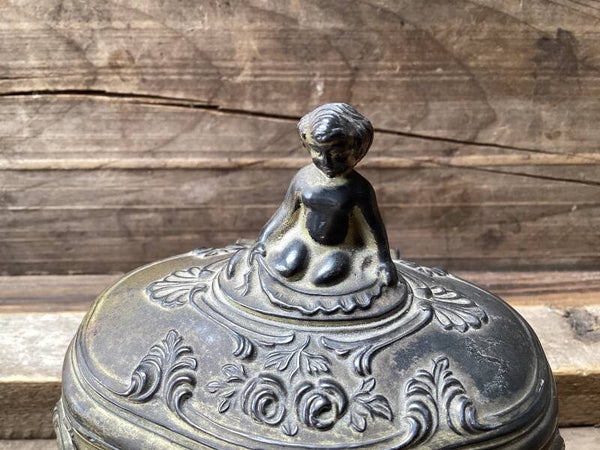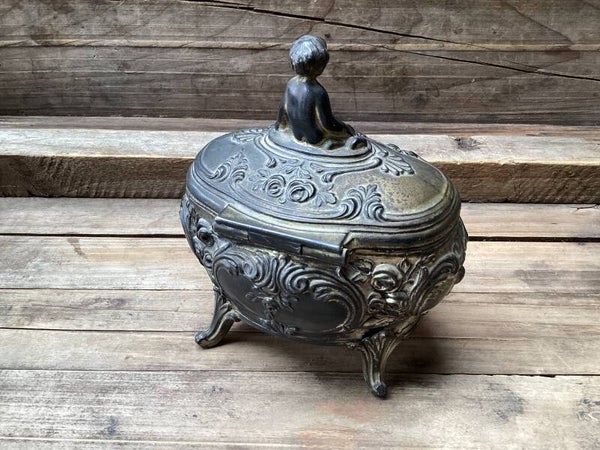 Afm.13x12x8 cm, met originele bekleding. Engeltje op deksel.