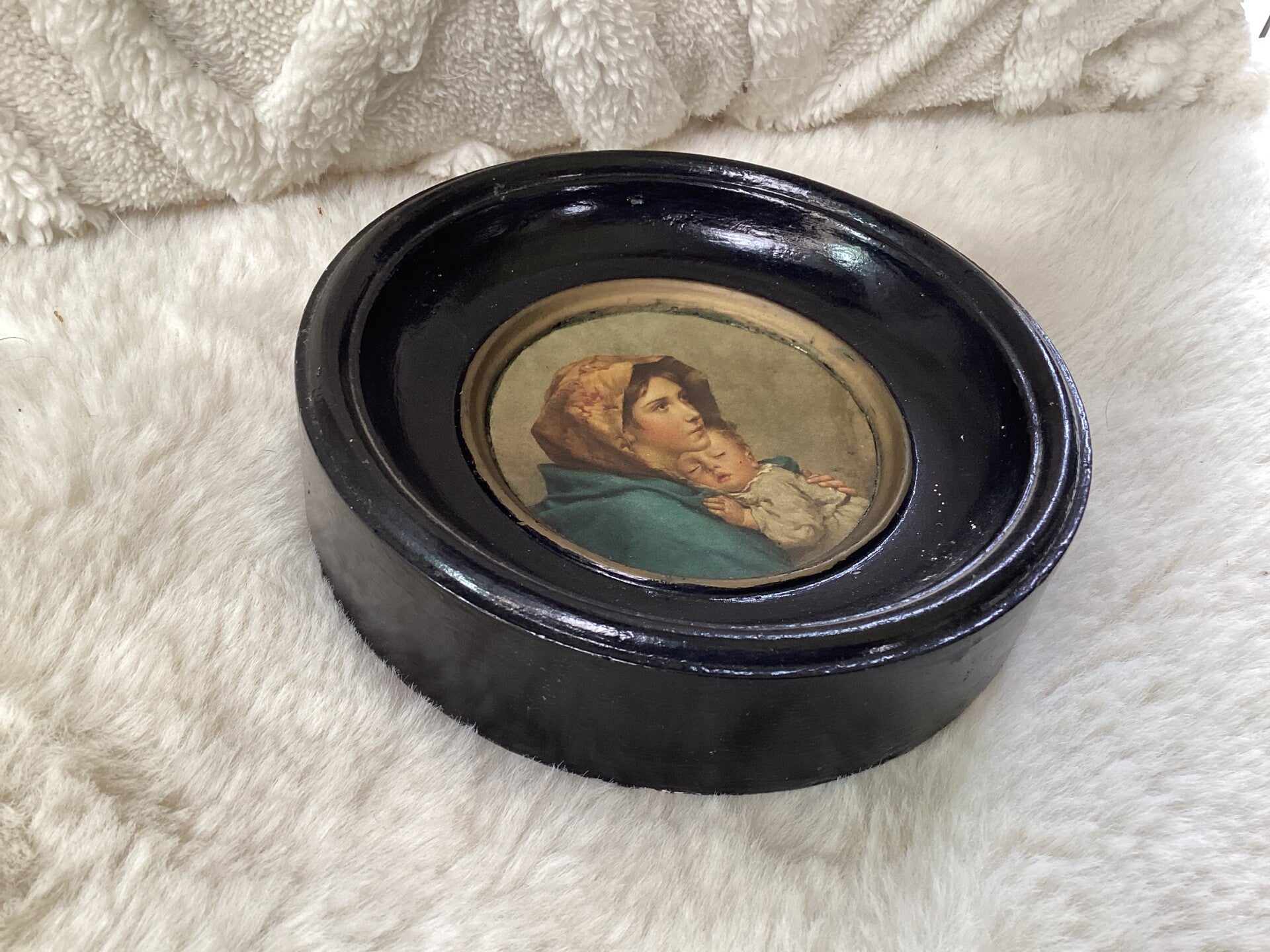 Antiek schilderijtje, Maria met kindje Jezus, diameter 15 cm