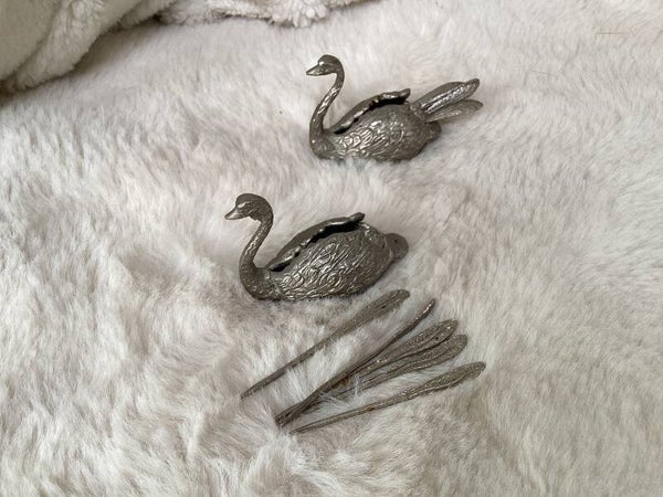 2 mooi bewerkte zwanen, met veren die cocktailprikkertjes blijken te zijn, per 2 voor 24,95