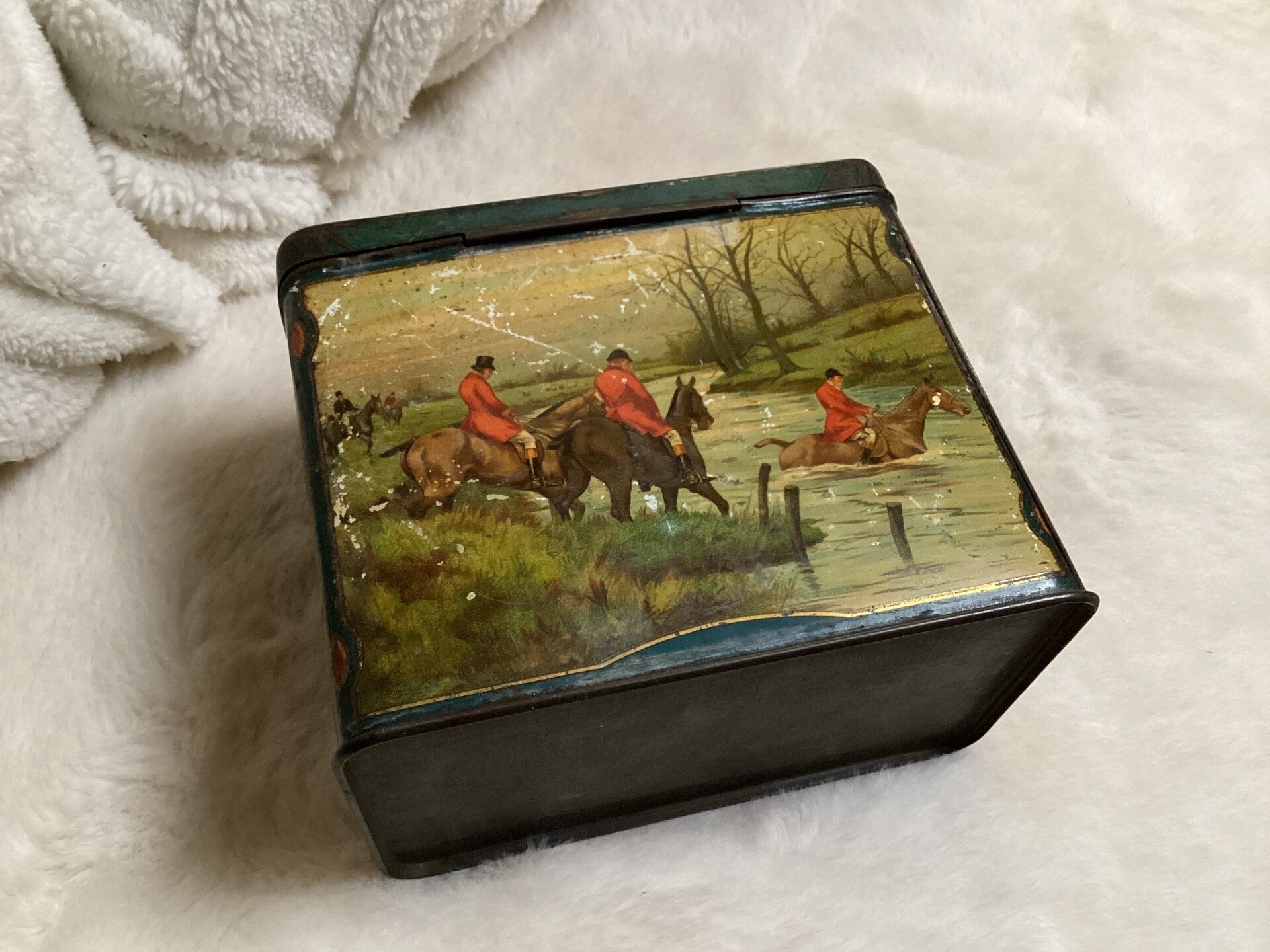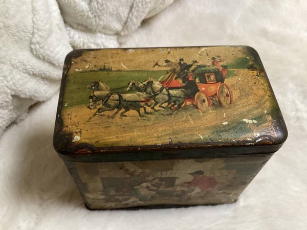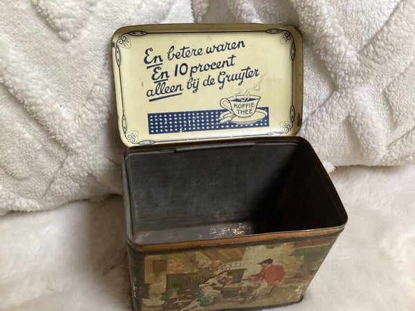 Dit rechthoekige vintage blikken trommel van De Gruyter is een ware vondst voor liefhebbers van nostalgische schatten. Met een scharnierend oversluitdeksel en een brocante uitstraling, brengt dit blik de charme van vervlogen tijden in huis. Het is gedecoreerd met een lichtgekleurde achtergrond waarop een Engels jachttafereel met paarden prijkt, met afbeeldingen die de sfeer van een traditionele vossenjacht oproepen. Een groene rand accentueert het deksel, terwijl de rest van het blik een mooie oude patina vertoont, vol met karakteristieke slijtageplekken.