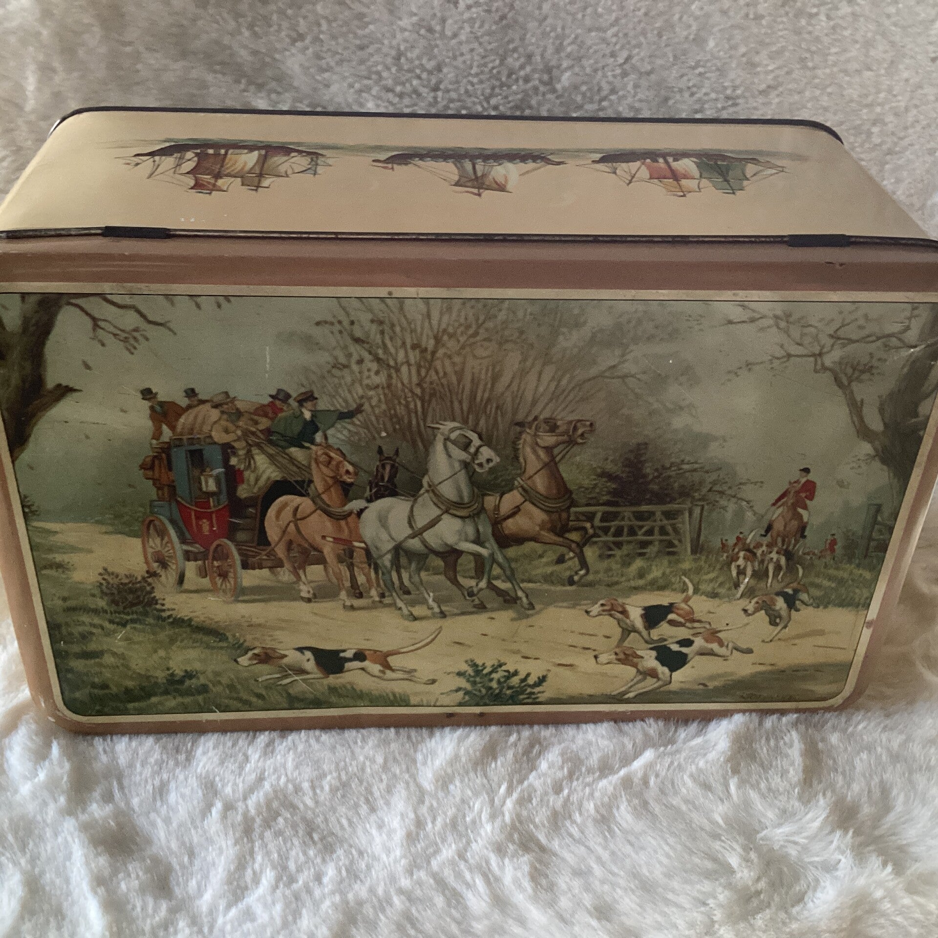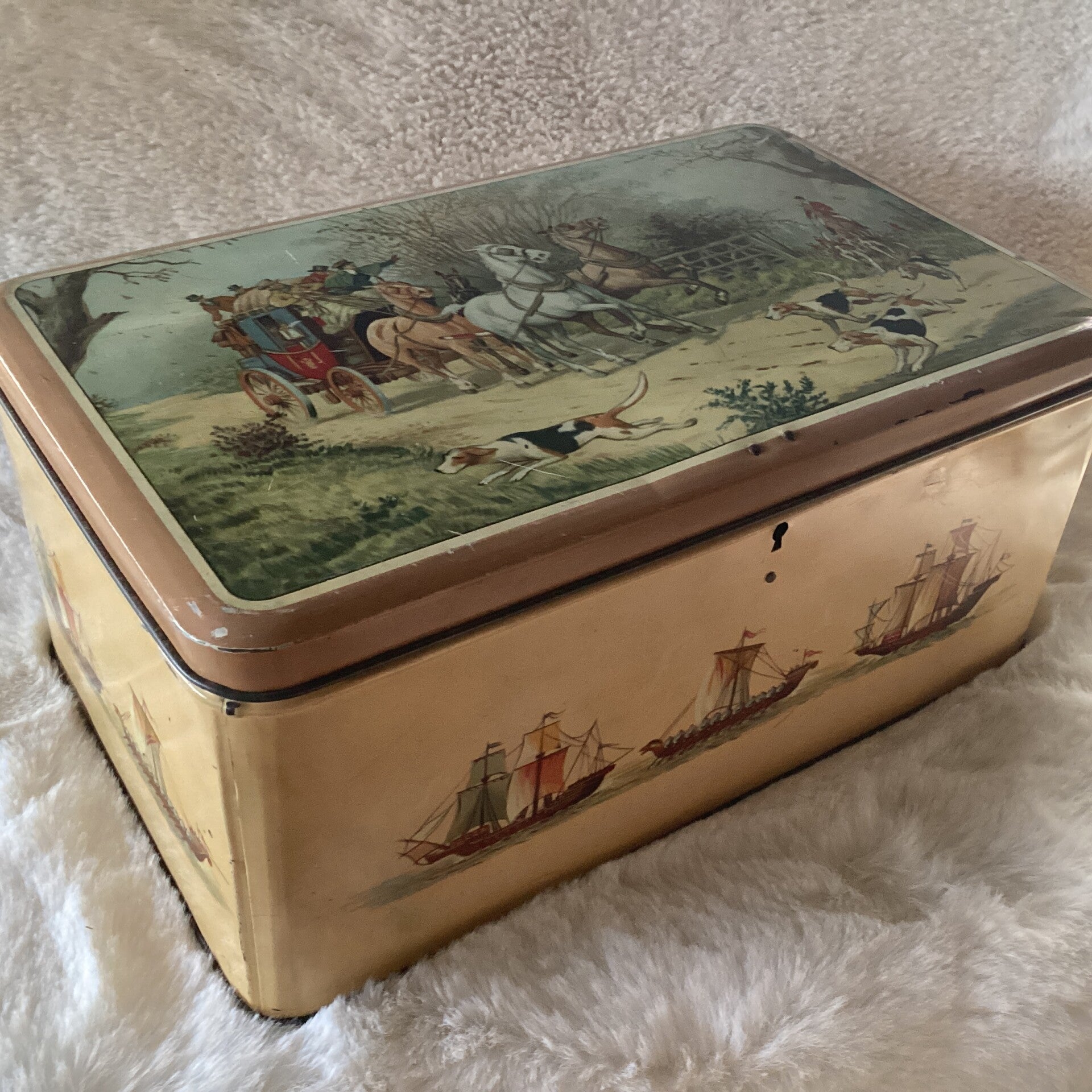 Groot oud blik met jachttafereel en oude zeilschepen rondom 32x20x14 cm