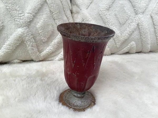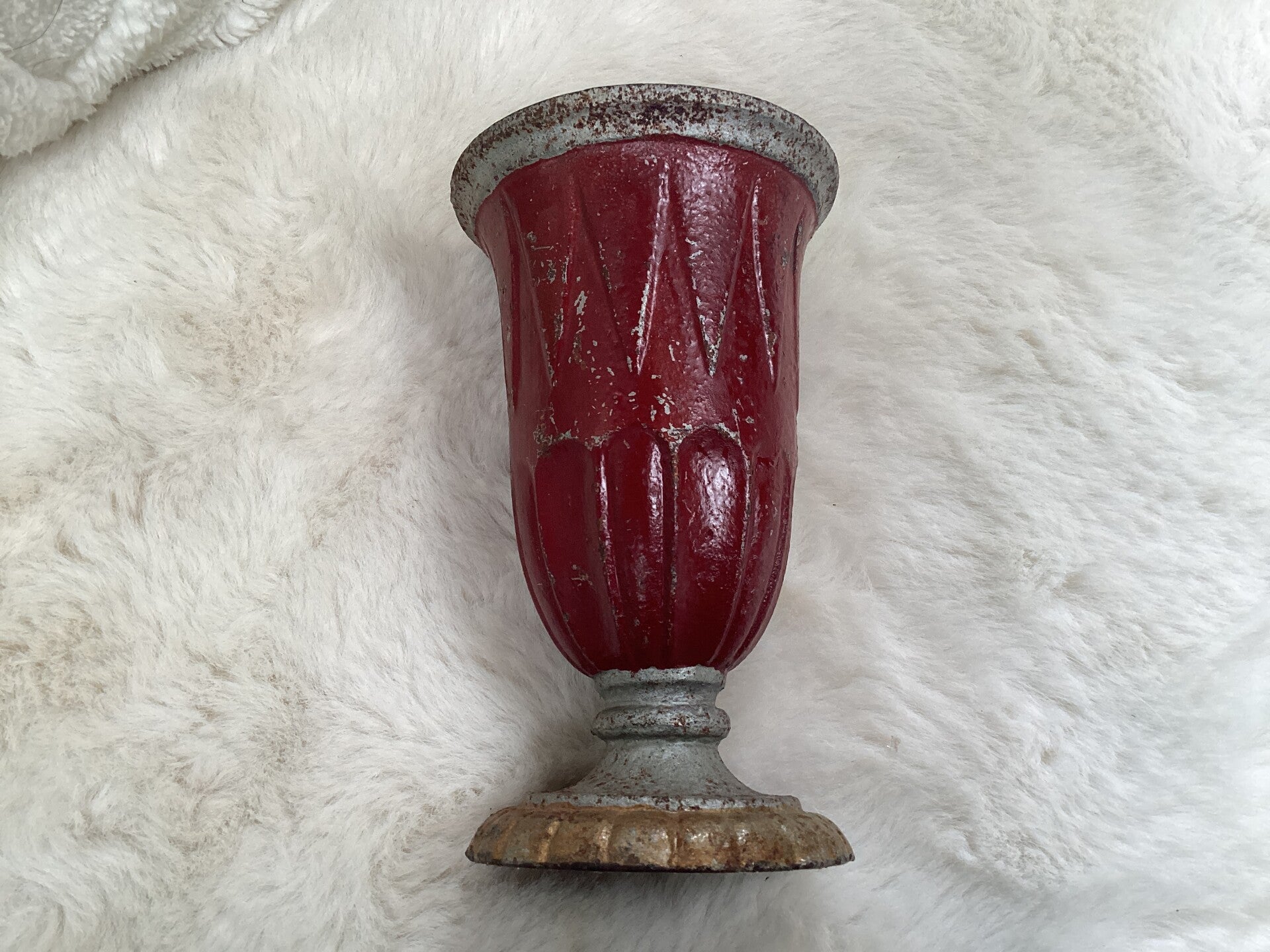 Gietijzeren tuinvaasje op voet, mooie kleur rood, 15 cm hoog