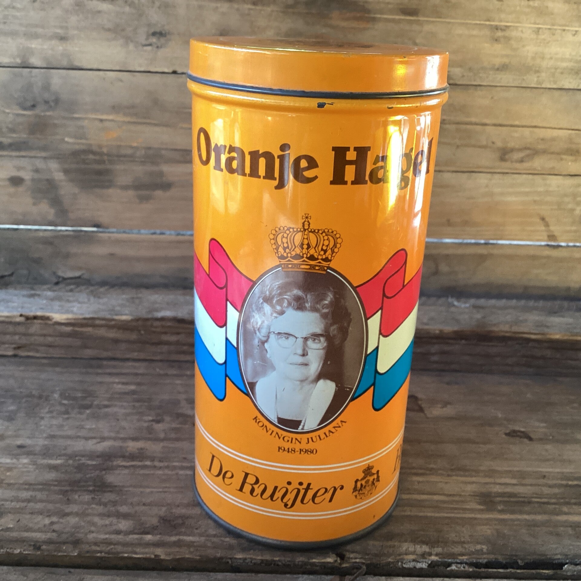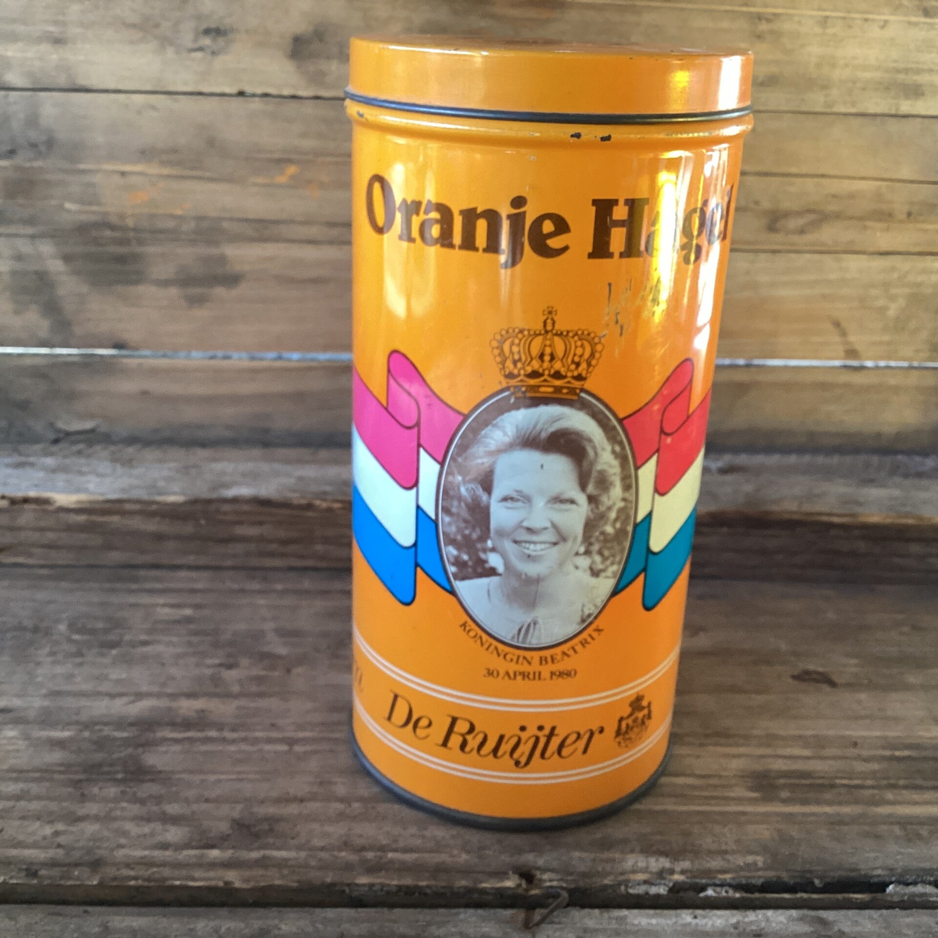 Vintage blik oranje hagel, 15x7,5 cm troonswisseling Juliana Beatrix 1980