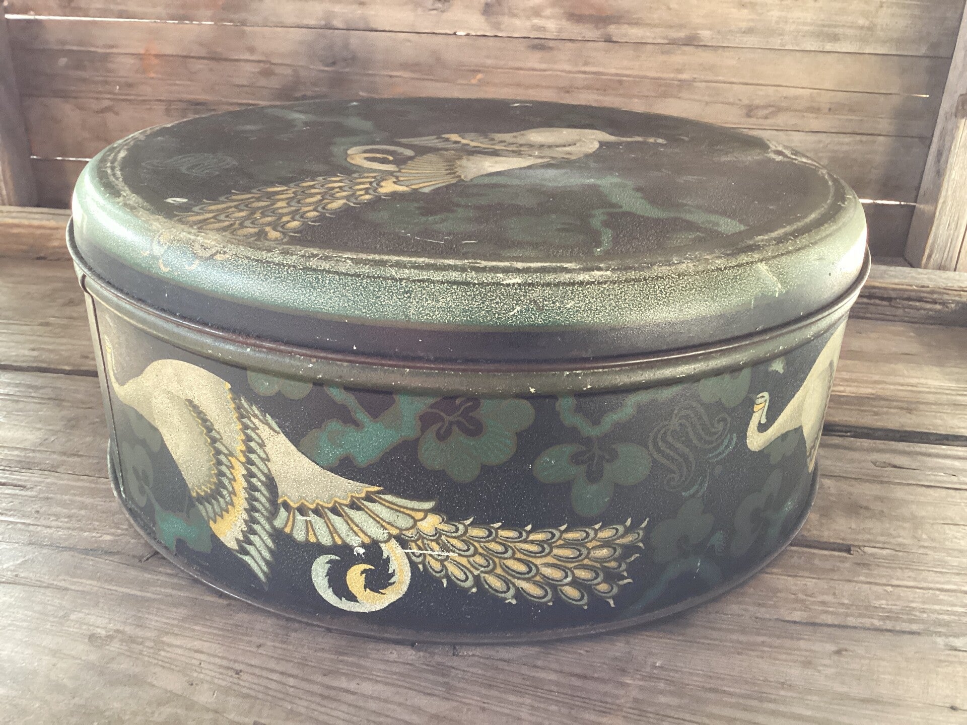 Antiek groot blik art deco pauwen rondom en op deksel, 27x11 cm