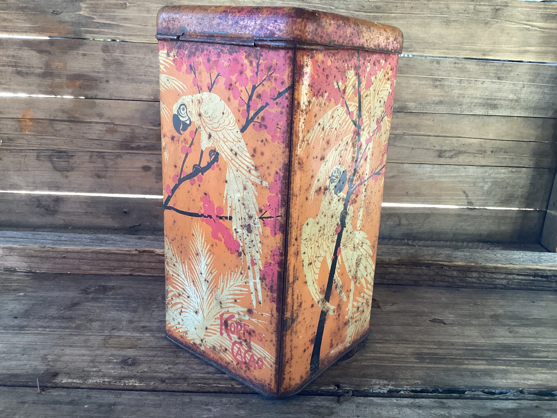 Antiek Korff’s cacao blik met papegaaien design 19,5x10 cm