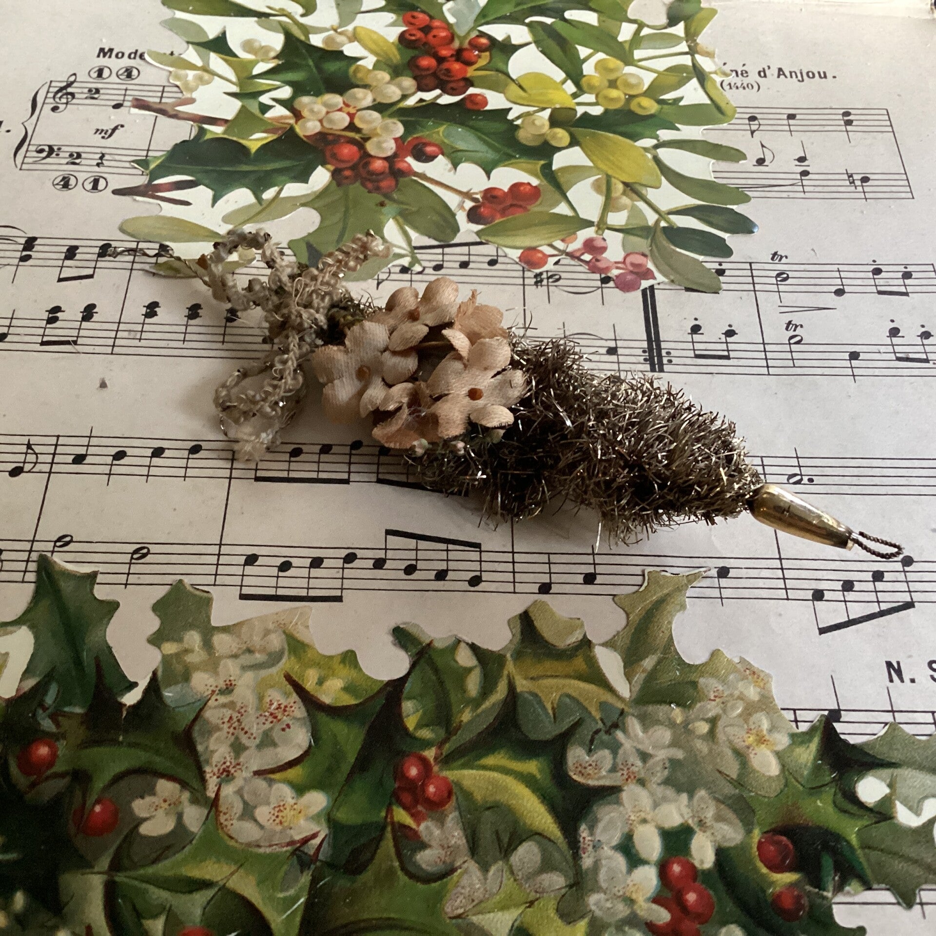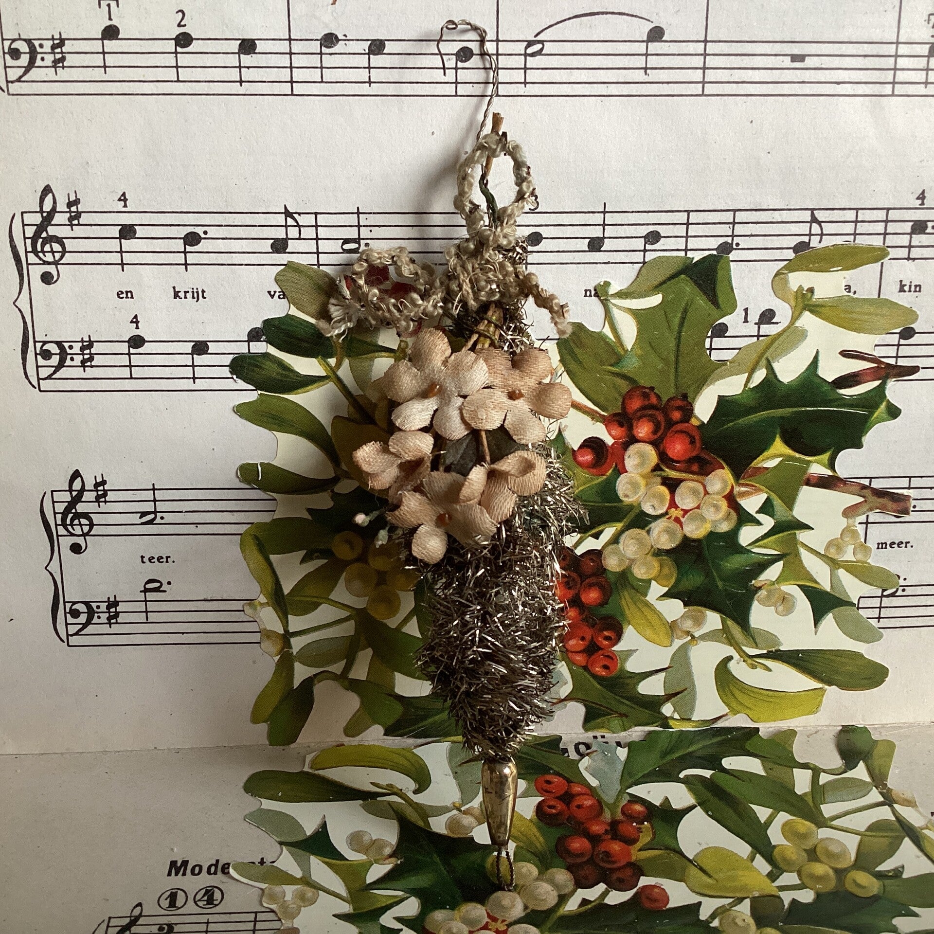 Victoriaans antieke tinsel paraplu met strik, prachtige bloemdecoratie en glazen kraal