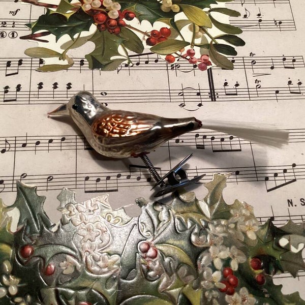Antieke kerstbal vogel op clip met fiberstaart, zilverkleur, met oranje gloed, 10 cm