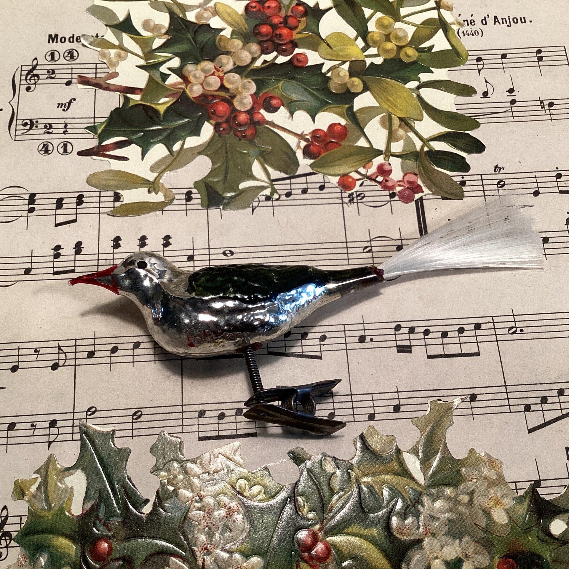 Antieke kerstbal vogel op clip met fiberstaart, zilverkleur, groen rood goud, 10 cm