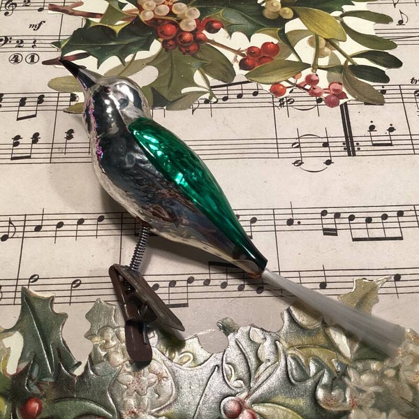 Antieke kerstbal vogel op clip met fiberstaart, zilverkleur, groene vleugels , 10 cm
