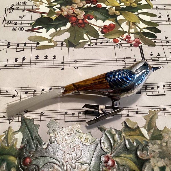 Antieke kerstbal vogel op clip met fiberstaart, zilverkleur, blauw, goud, 10 cm