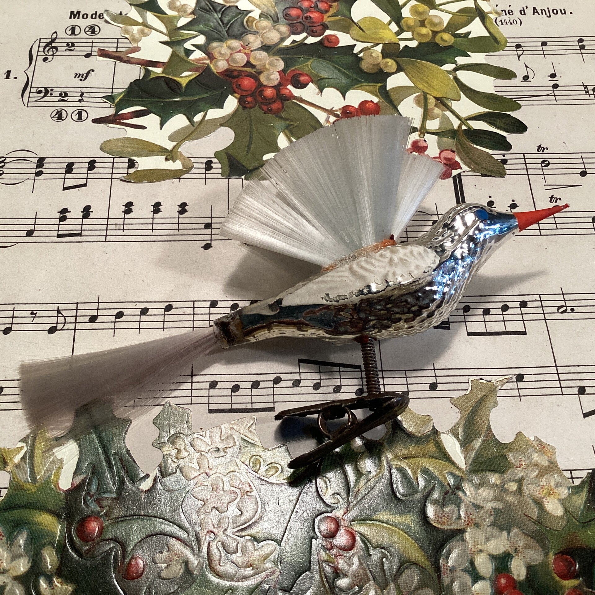 Antieke kerstbal vogel op clip met fiberstaart, fibervleugels, zilverkleur, 14x8x2 cm