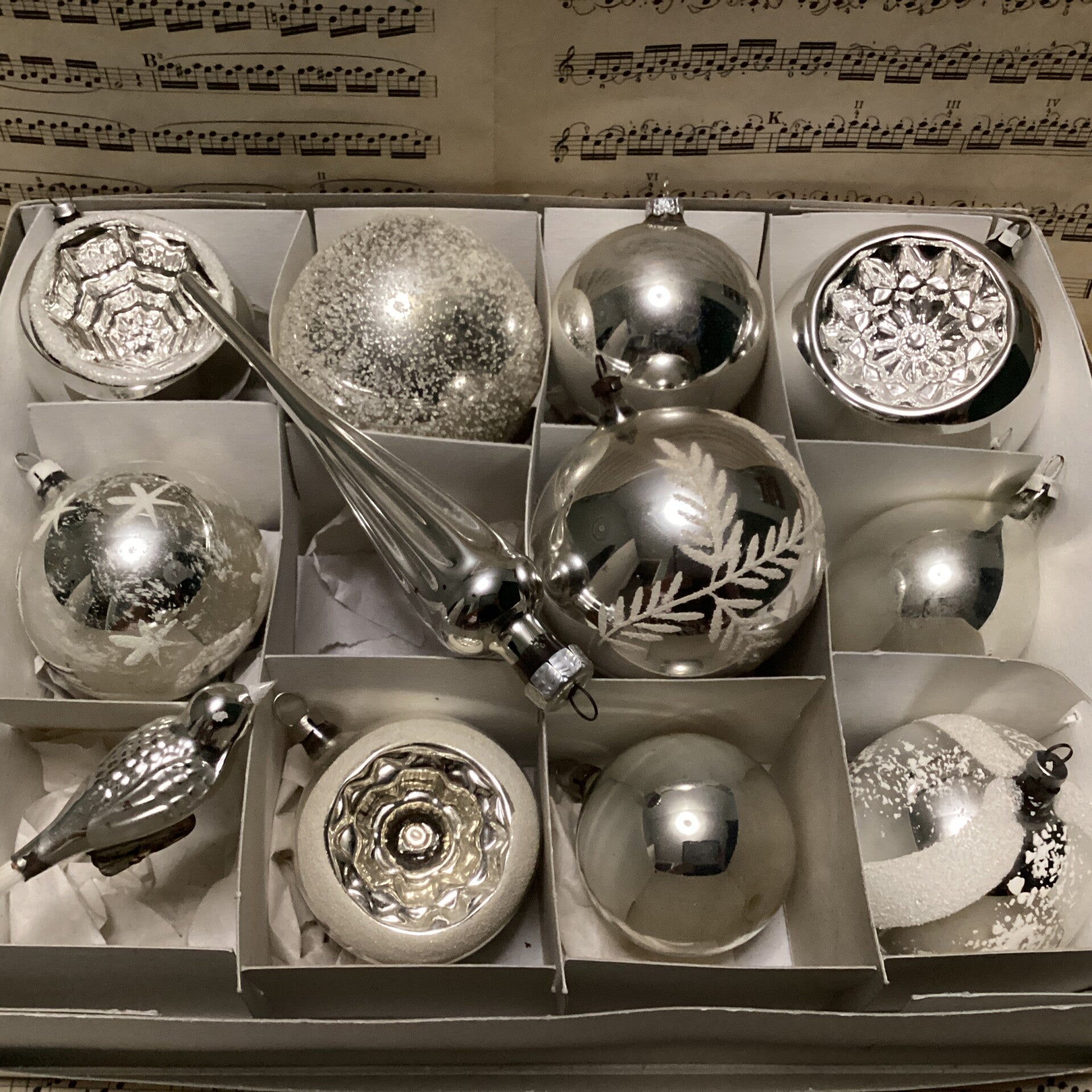 Verzameldoos nr. 60. Met zilver glazen kerstballen en figuren, diam.8 cm