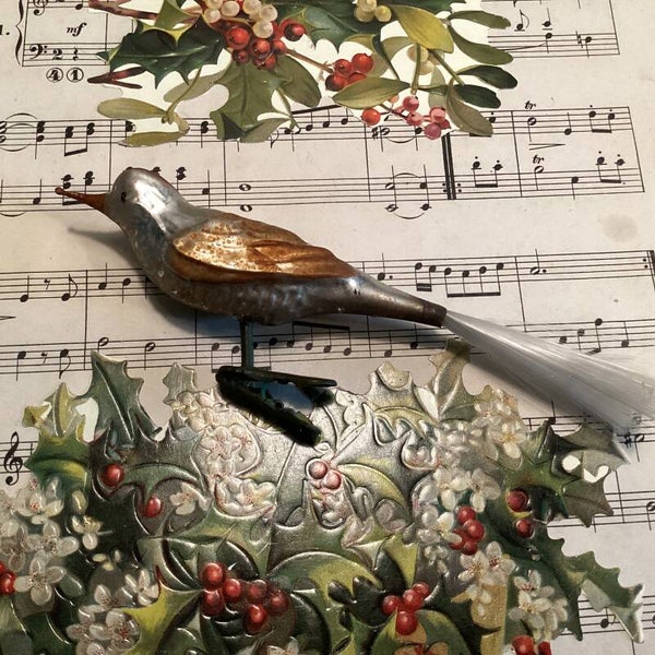 Antieke kerstbal vogel, bruin gewaxt,mat zilver, 15 cm op clip met fiberstaart