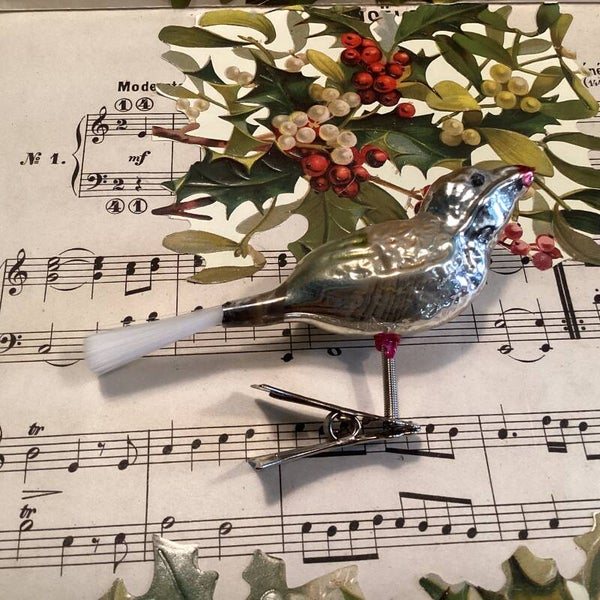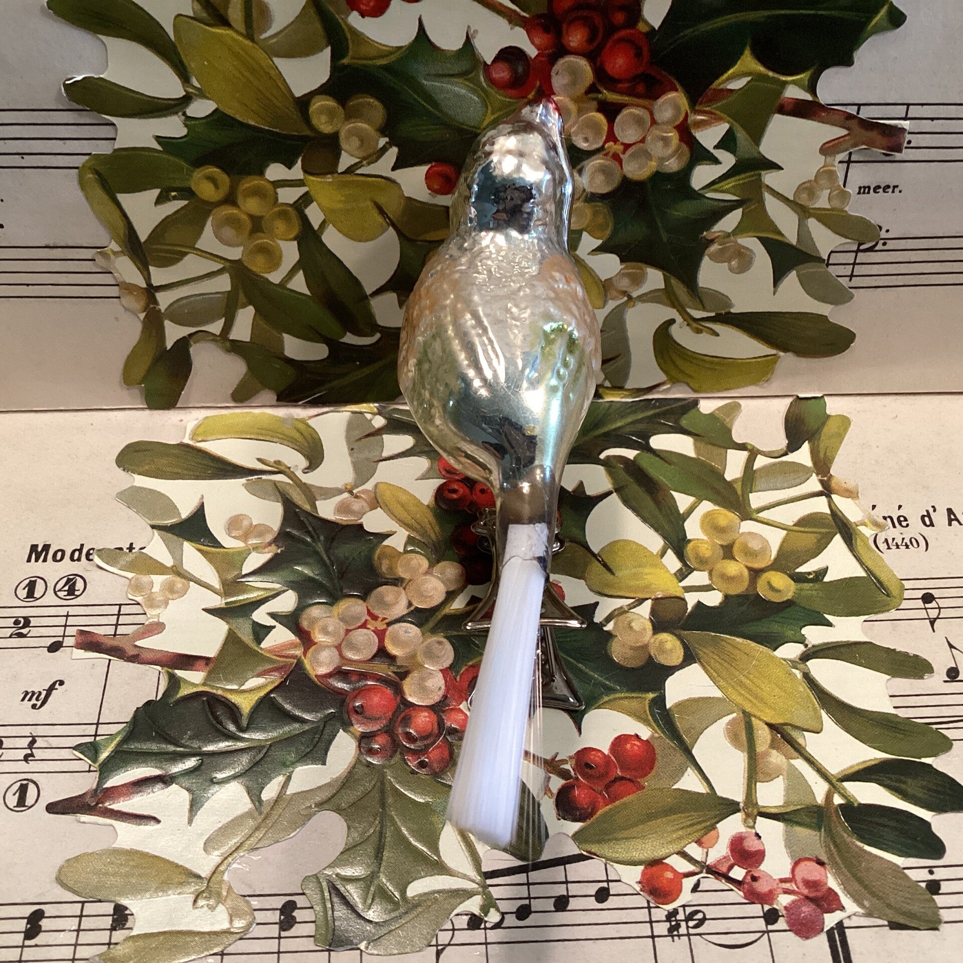 Antieke kerstbal vogel op clip, fiberstaart, 12 cm groen, goud, zilver