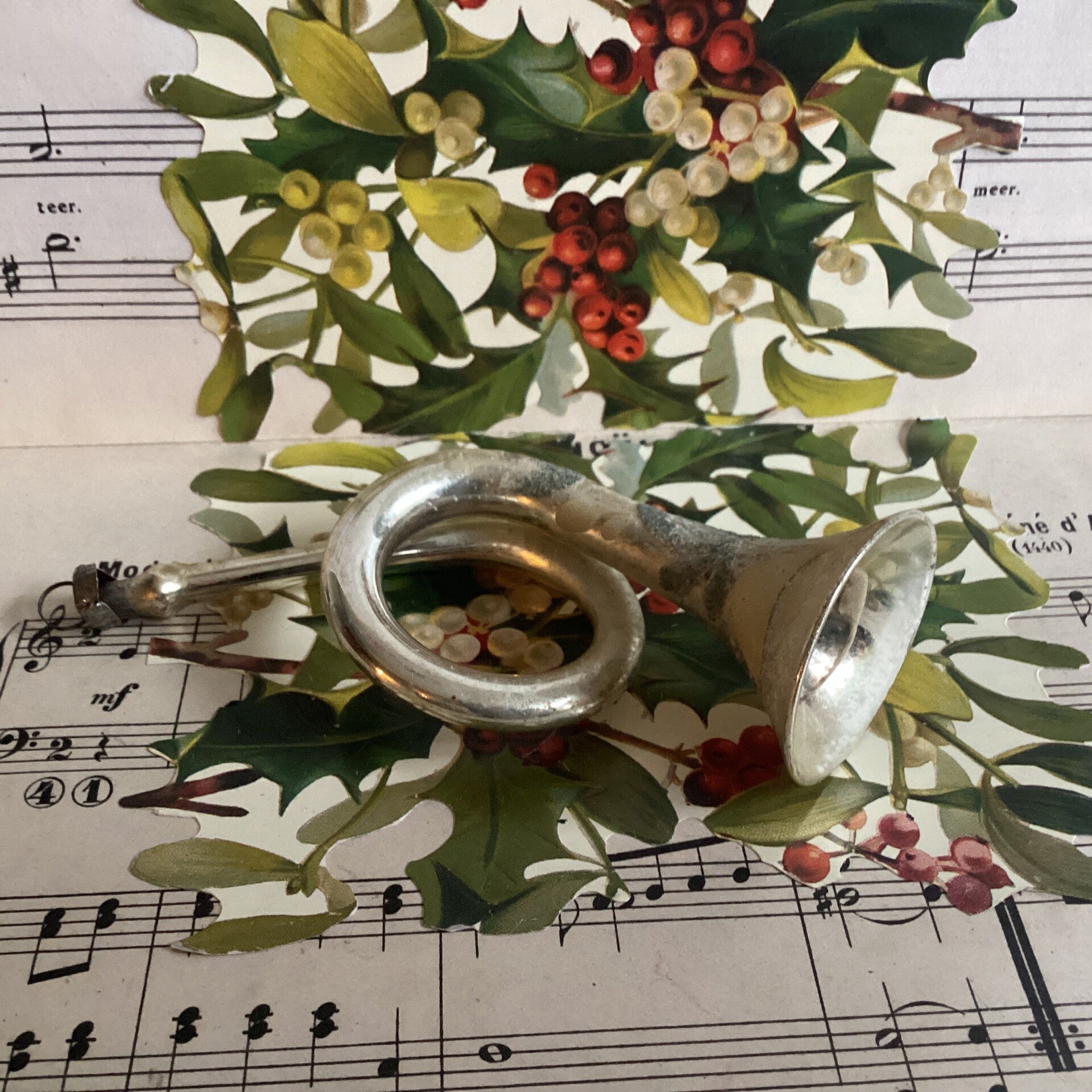 Antieke kerstbal trompet met witte en donkergesuikerde takjes, geen rietje, 11 cm