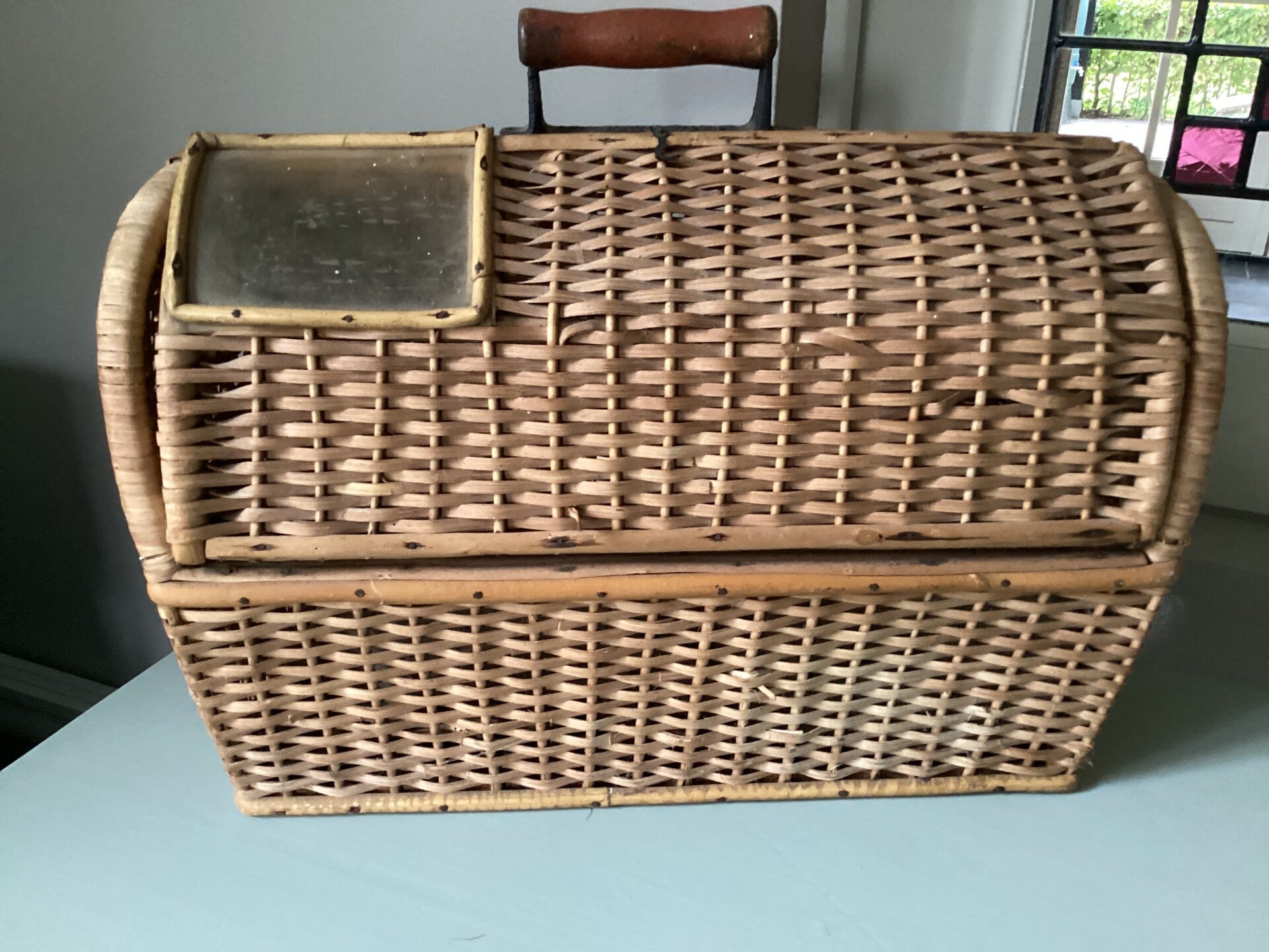 Antieke reiskoffer met houten handvat en venster periode 1940-45