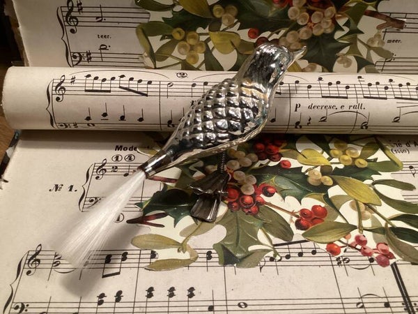 Antieke kerstbal vogel op clip, fiberstaart, brede reliëf rug,wax resten rug 13 cm