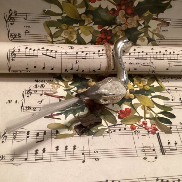 Antieke kerstbal zwaan op clip, fiberstaart, zwarte snavel, gesuikerde vleugels, 15 cm