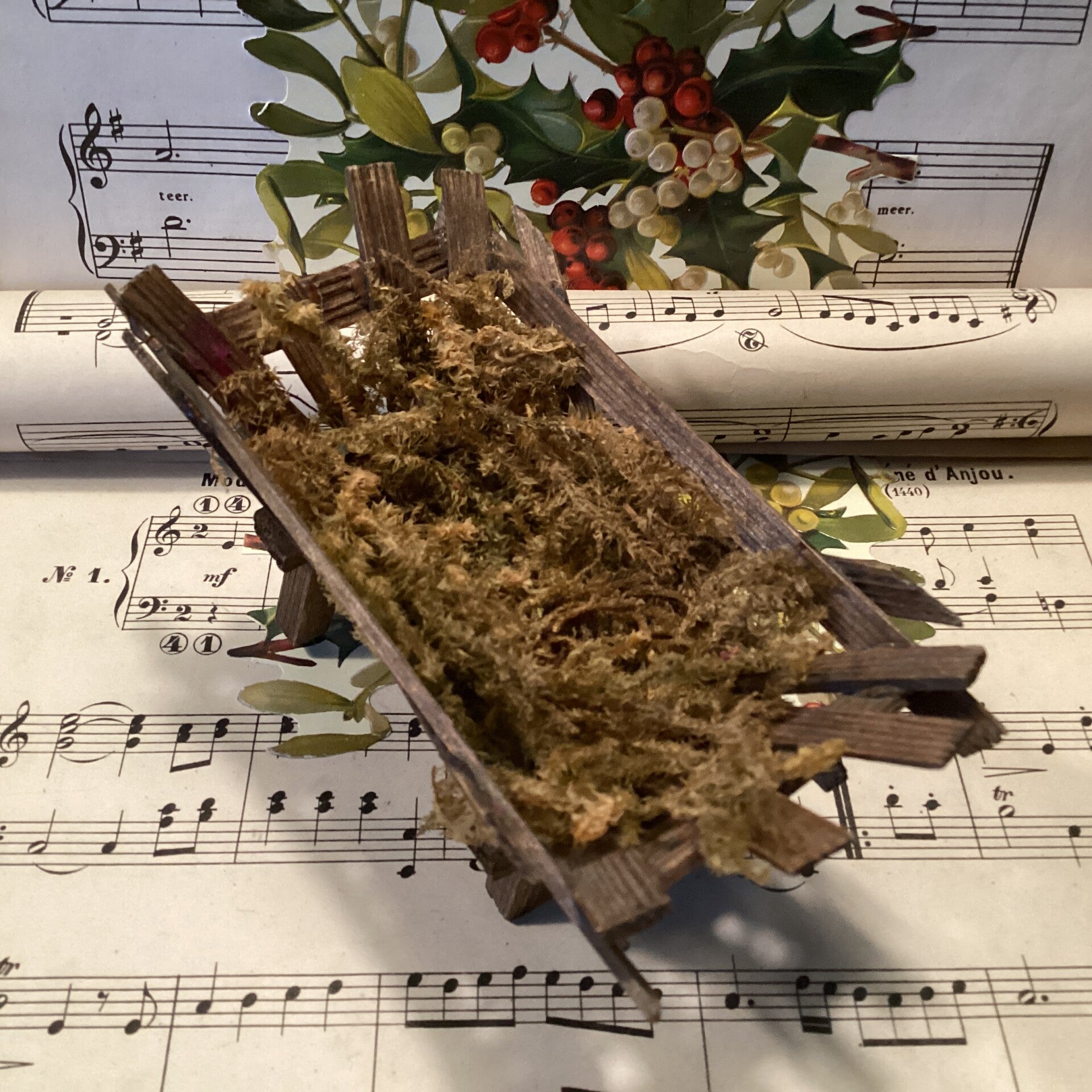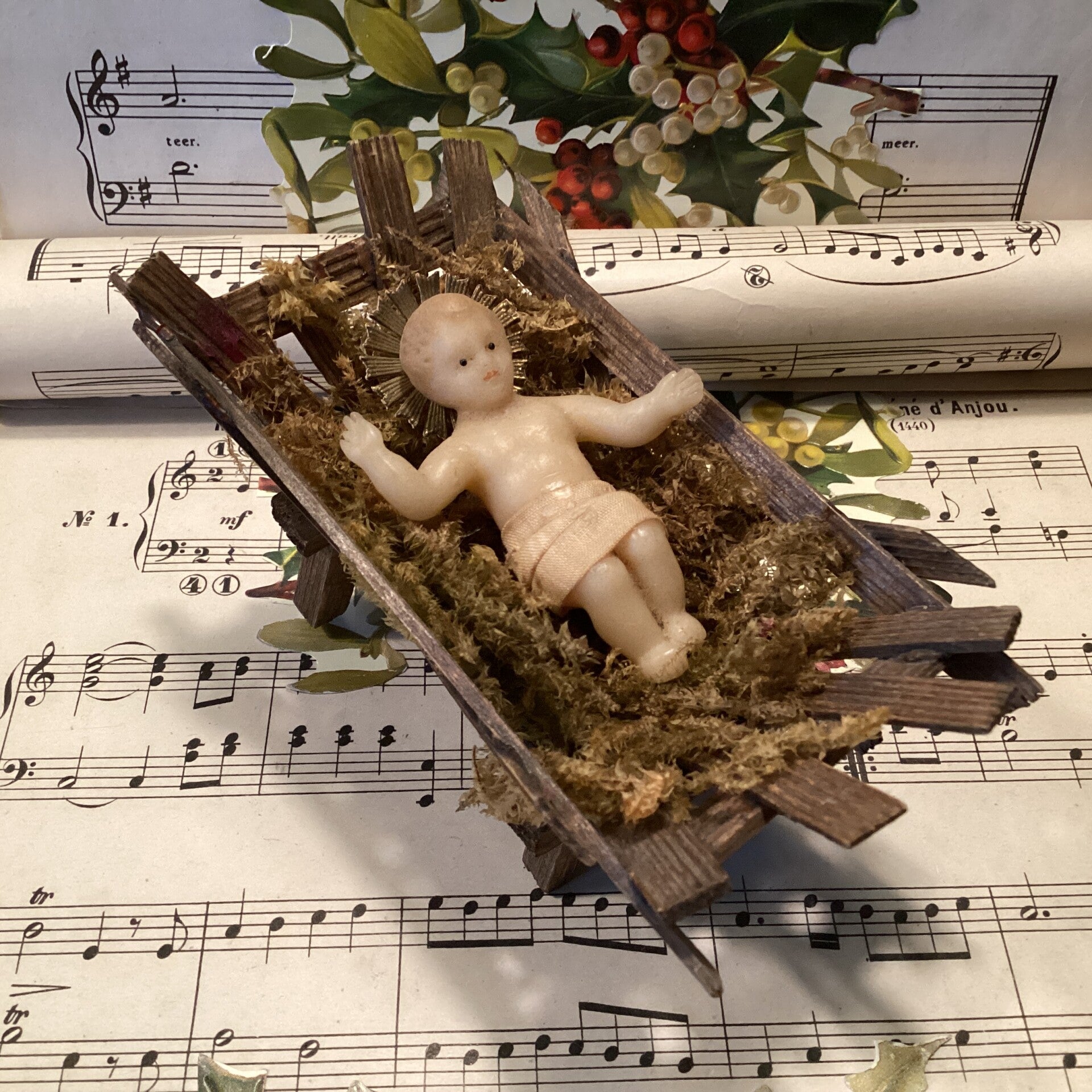 Antiek gewaxte Jezusbeeldje in houten kribbe 13x8x6 cm