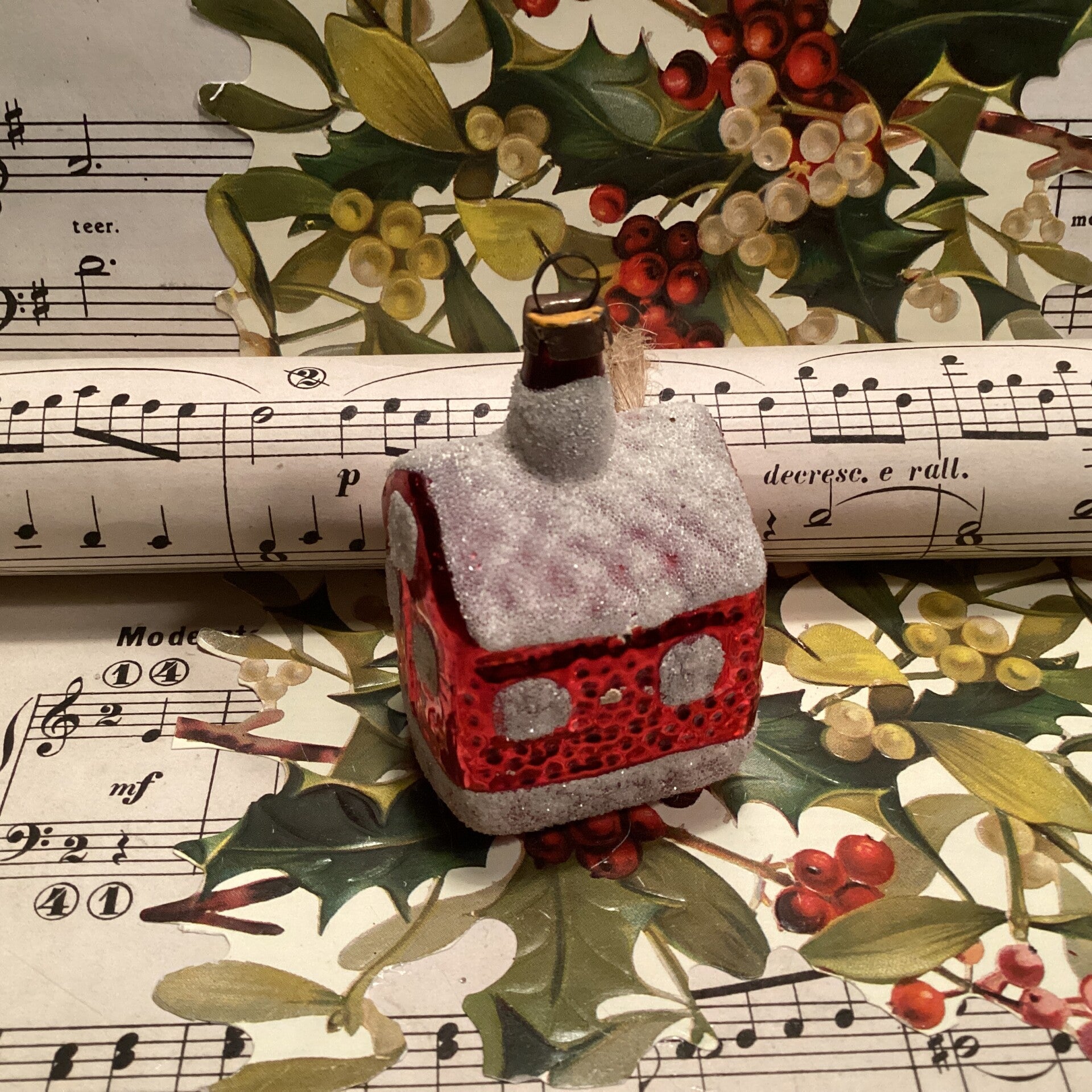 Antieke kerstbal gesuikerd rood huisje, 6x4x3 cm