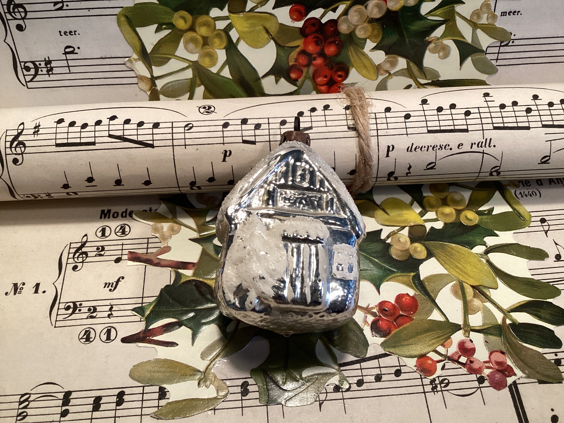 Antieke kerstbal huisje, gesuikerde dakjes, 5x4x3 cm