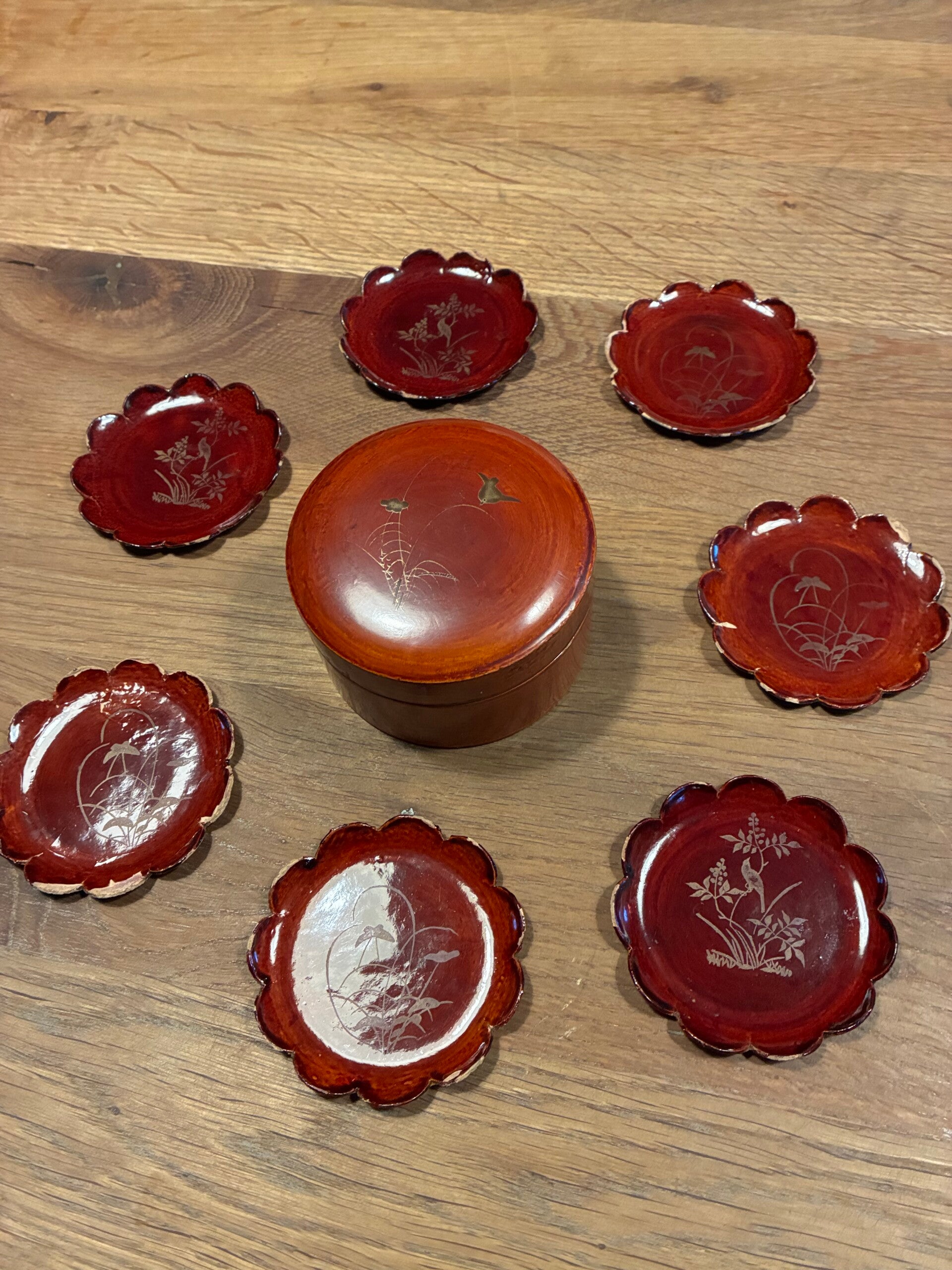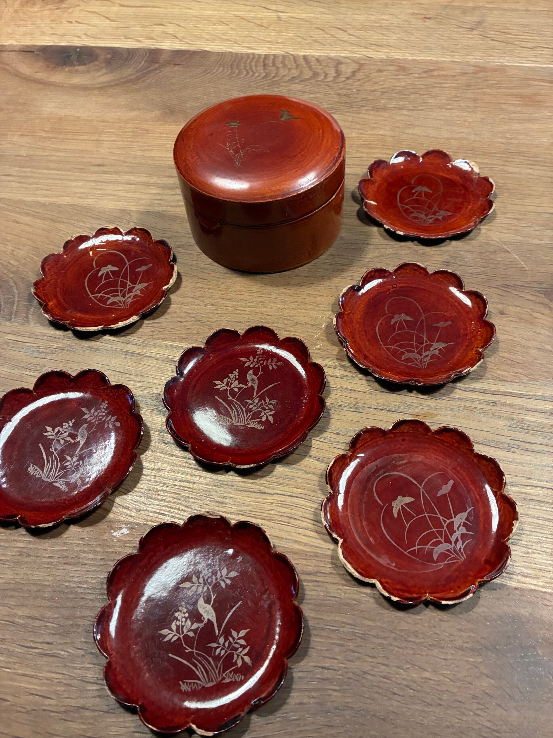 Deze set bestaat uit een Japans lakdoosje met onderzetters.
