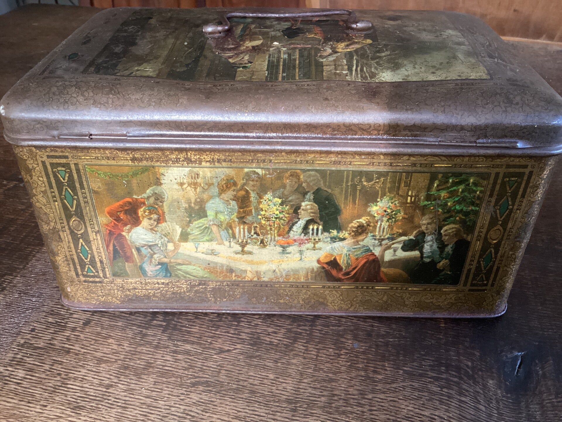 Antiek groot kerst blik met mooie voorstellingen 32x20x15 cm meer dan 100 jaar oud