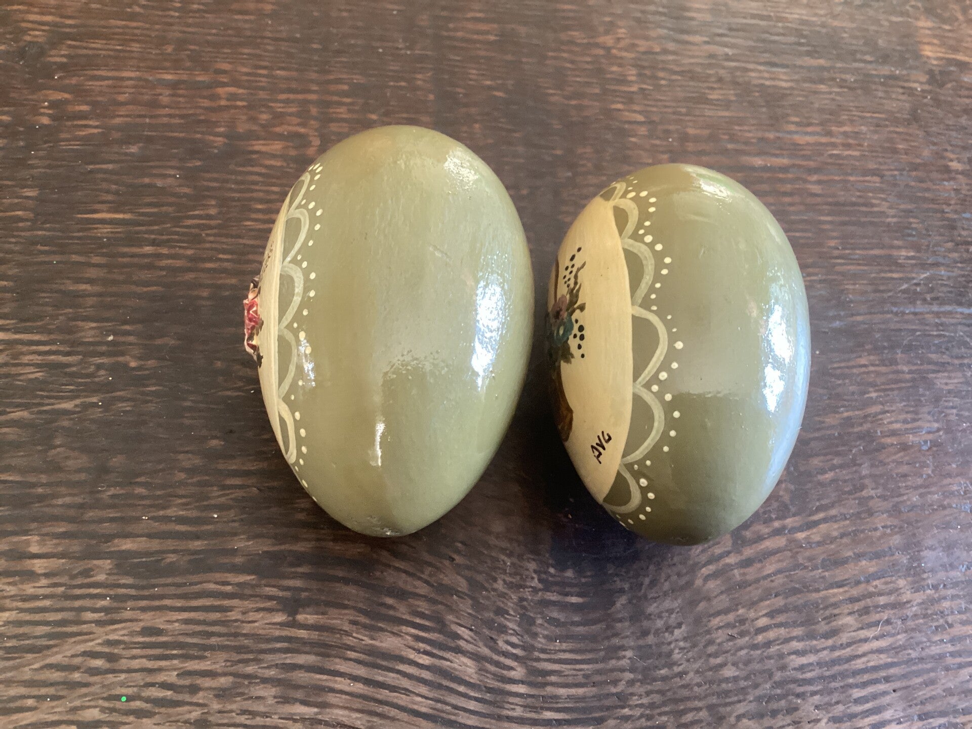 2 antiek handbeschilderde houten eieren 6,5x4 cm in reliëf