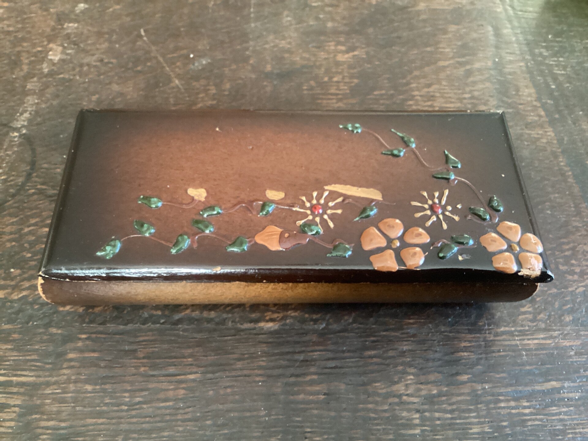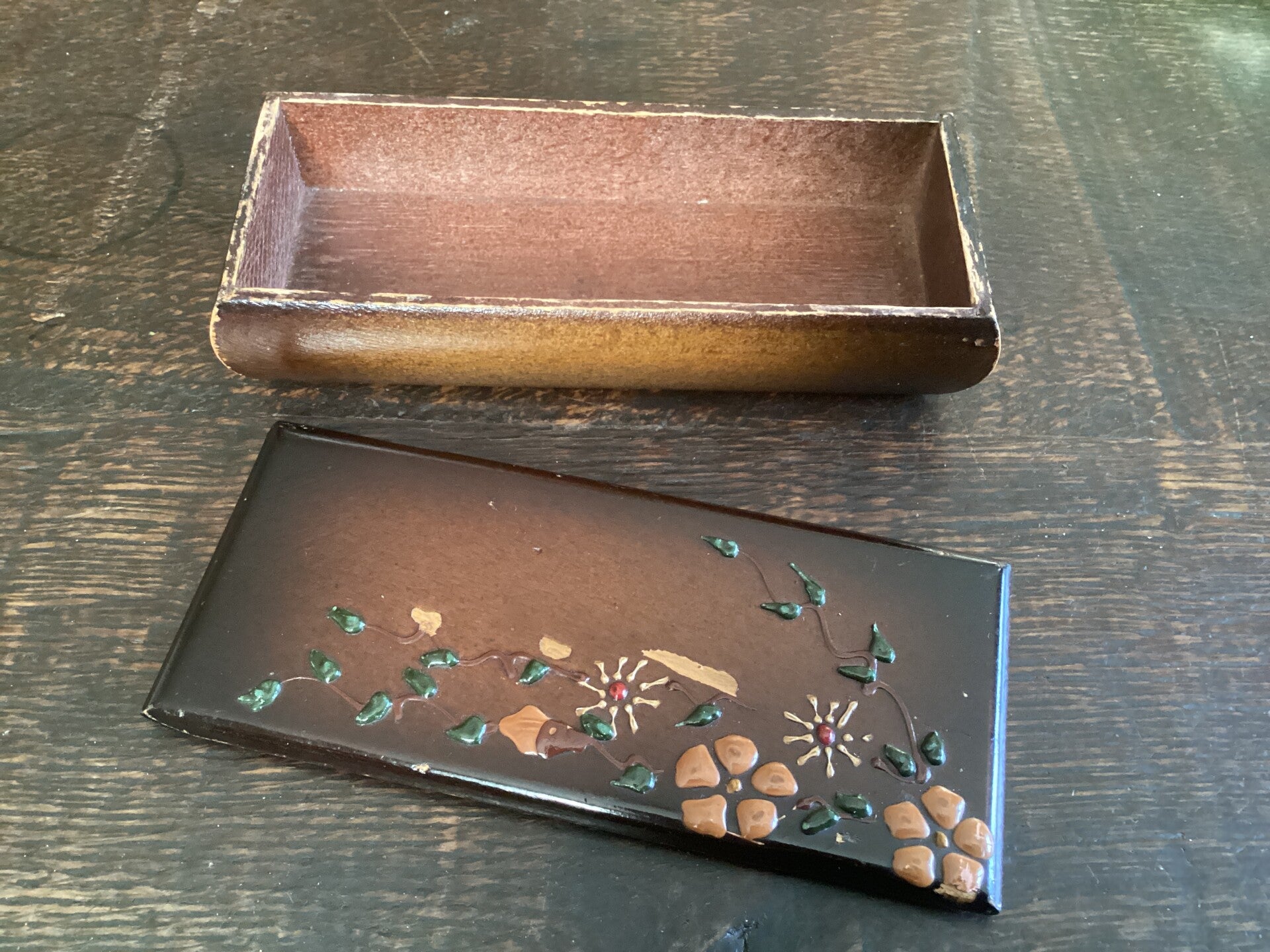 Mooi oud houten opbergdoosje met bloemen, takjes, gelakt, in reliëf, 15x7,5x3 cm