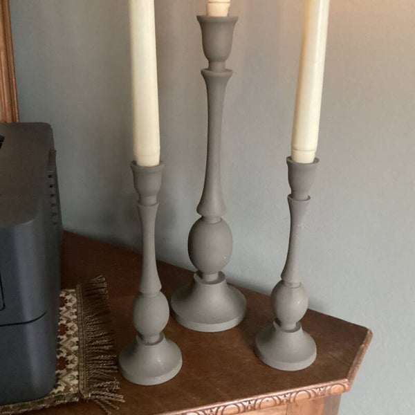 Hoogte 23 en 33 cm, mat groen grijs met kaarsen op batterijen