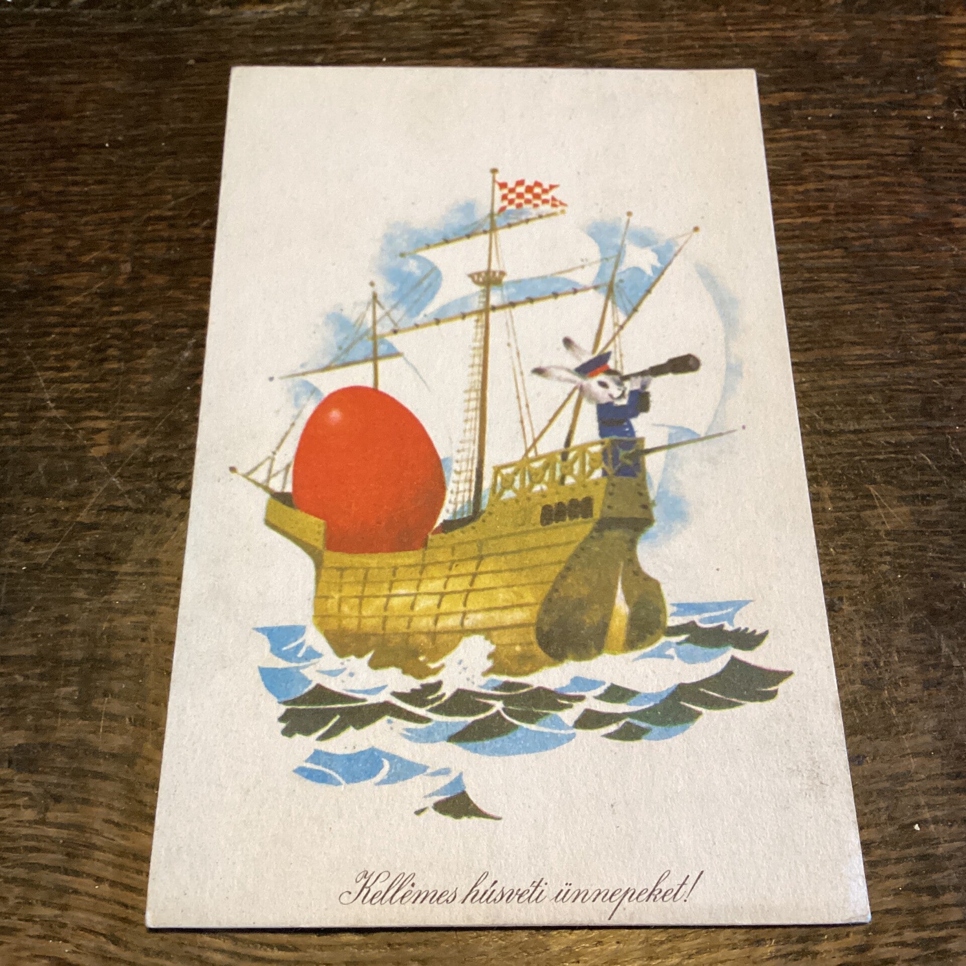 Antieke paaskaart met haas op schip, 1965
