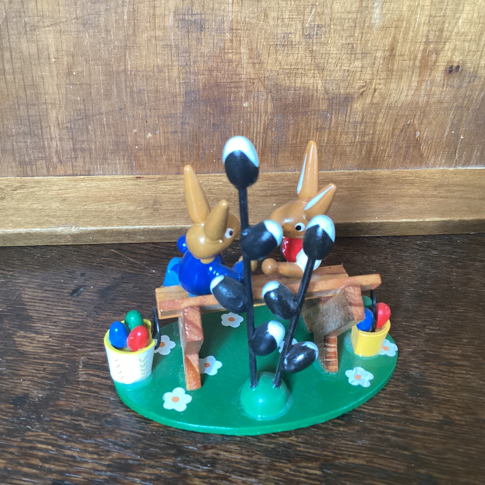 Ertsgebergte hazen echtpaar op bank met emmers met eitjes en voorjaarstakken 11 cm hoog, 10 cm breed