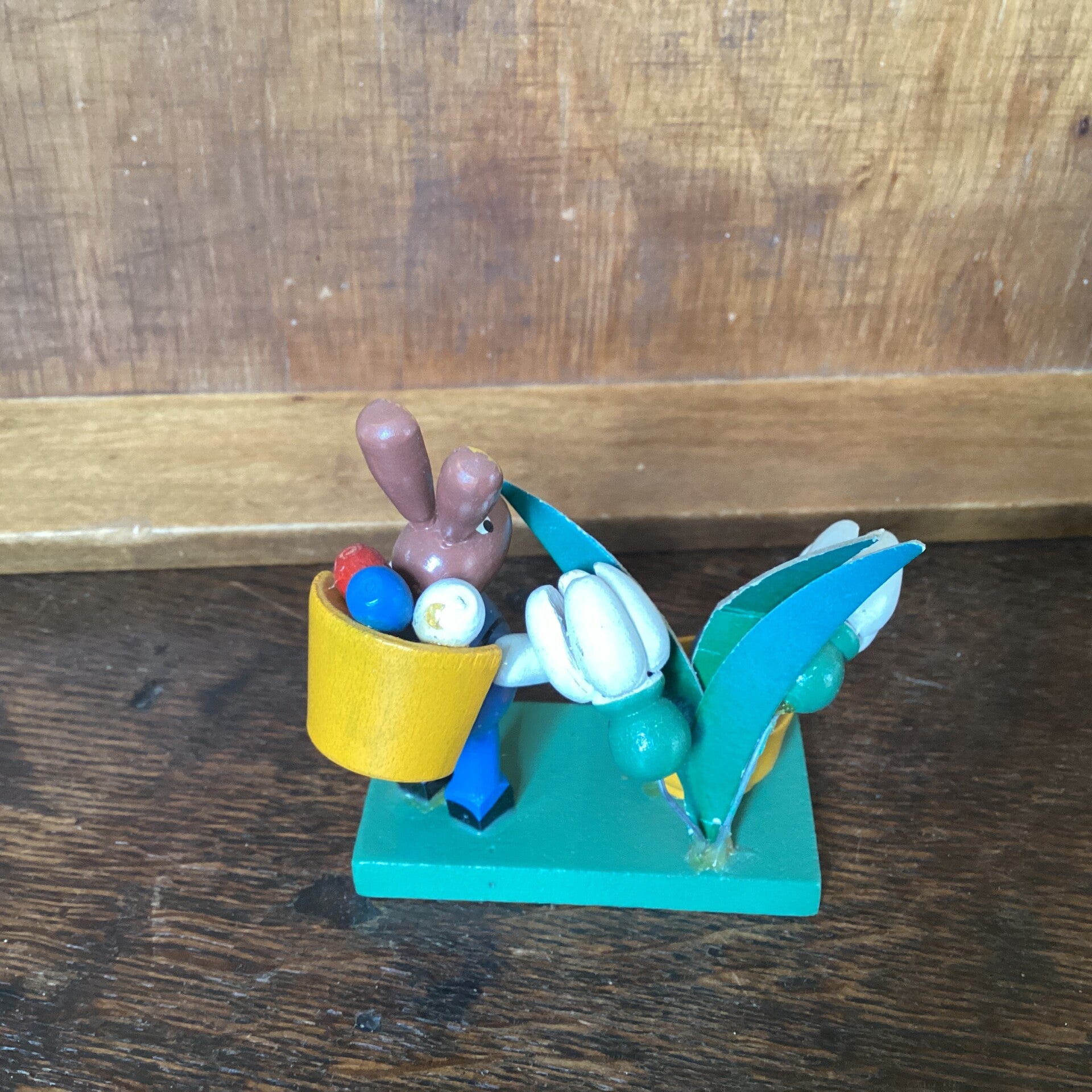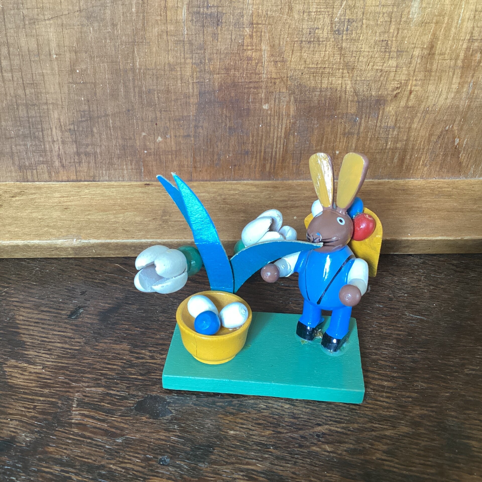 Ertsgebergte haas met mand eieren op zijn rug, bloemen en schaal 8 cm