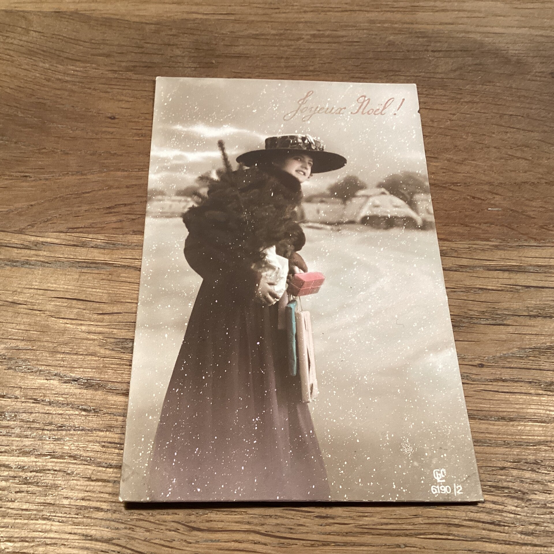 Antieke kerstkaart vrouw met cadeautjes, 1917